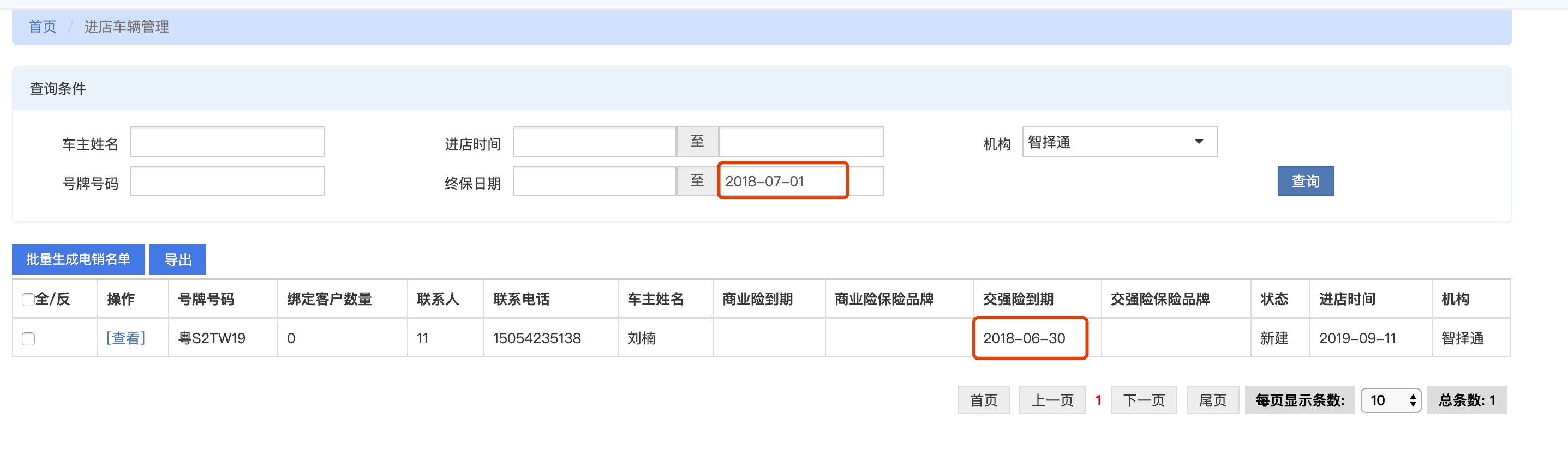 【电销管理】进店车辆,查询时设置终保日期等于数据的终保日期,无法查询到数据,需要设置数据终保日期的后一天才可查到数据