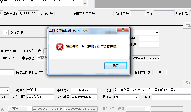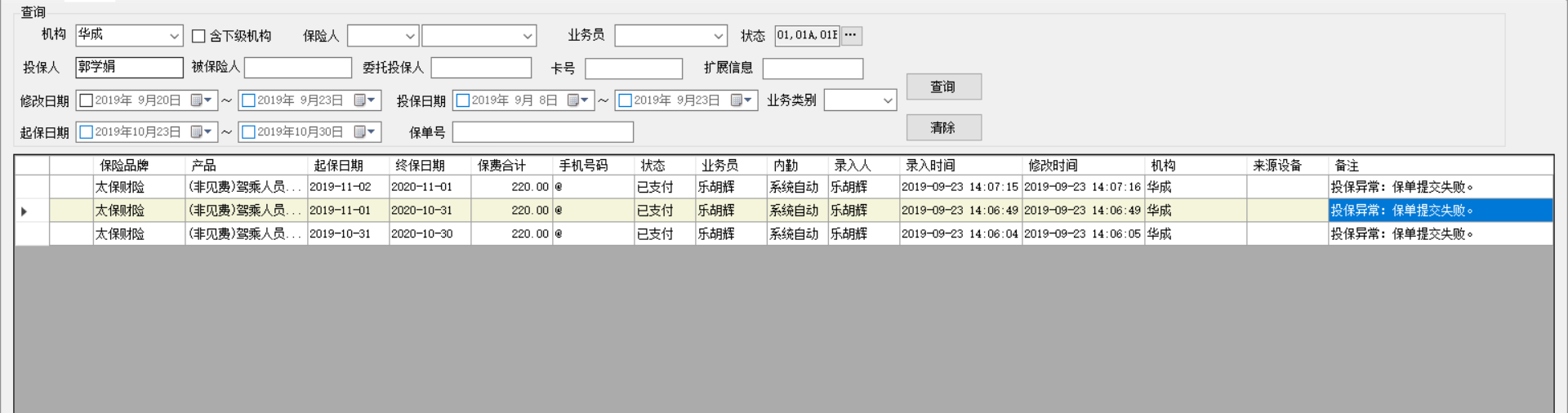 描述:上述车投保(非见费驾乘人员人身意外伤害险 220)时,系统提示投保失败,生成的非车险保单显示已支付状态。