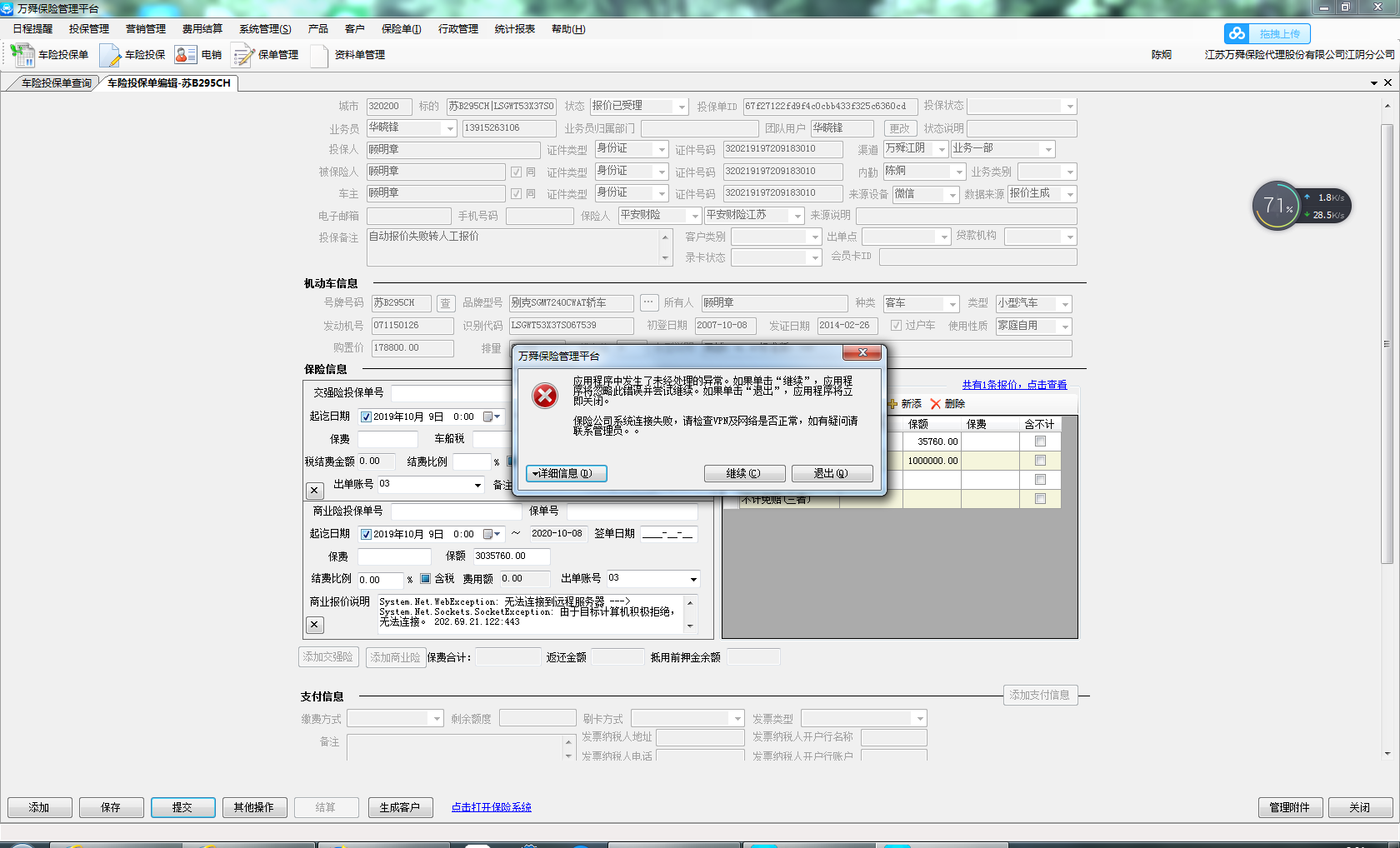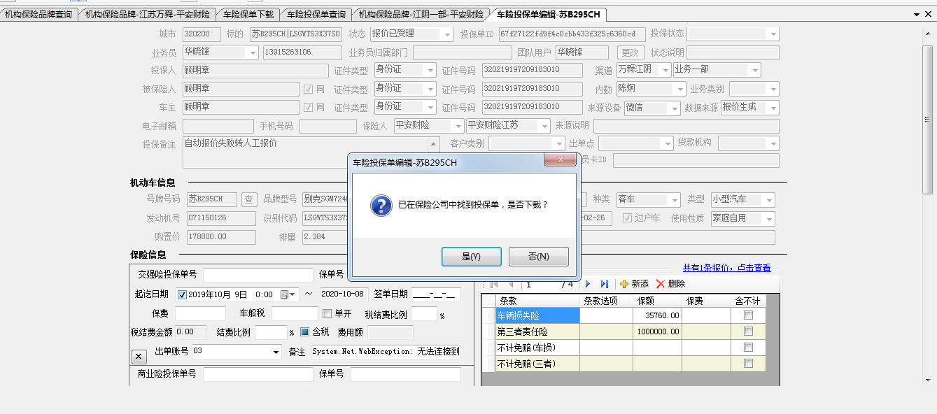 【万舜】投保单提交到已报价状态后提示已在保险公司系统中查到保单是否下载,点击确定后提示VPN连接失败