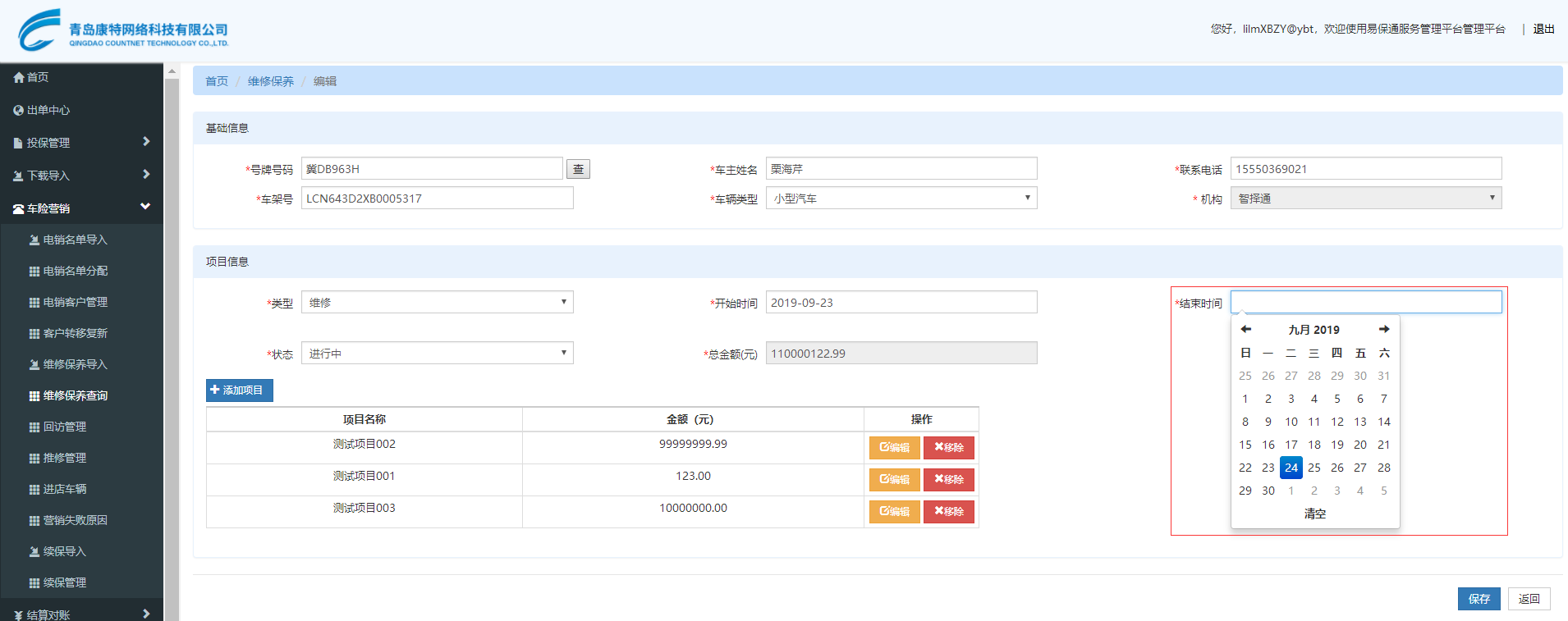 【电销管理】维修保养查询,结束时间未填写时点击保存,出发时间控件遮挡了提示语