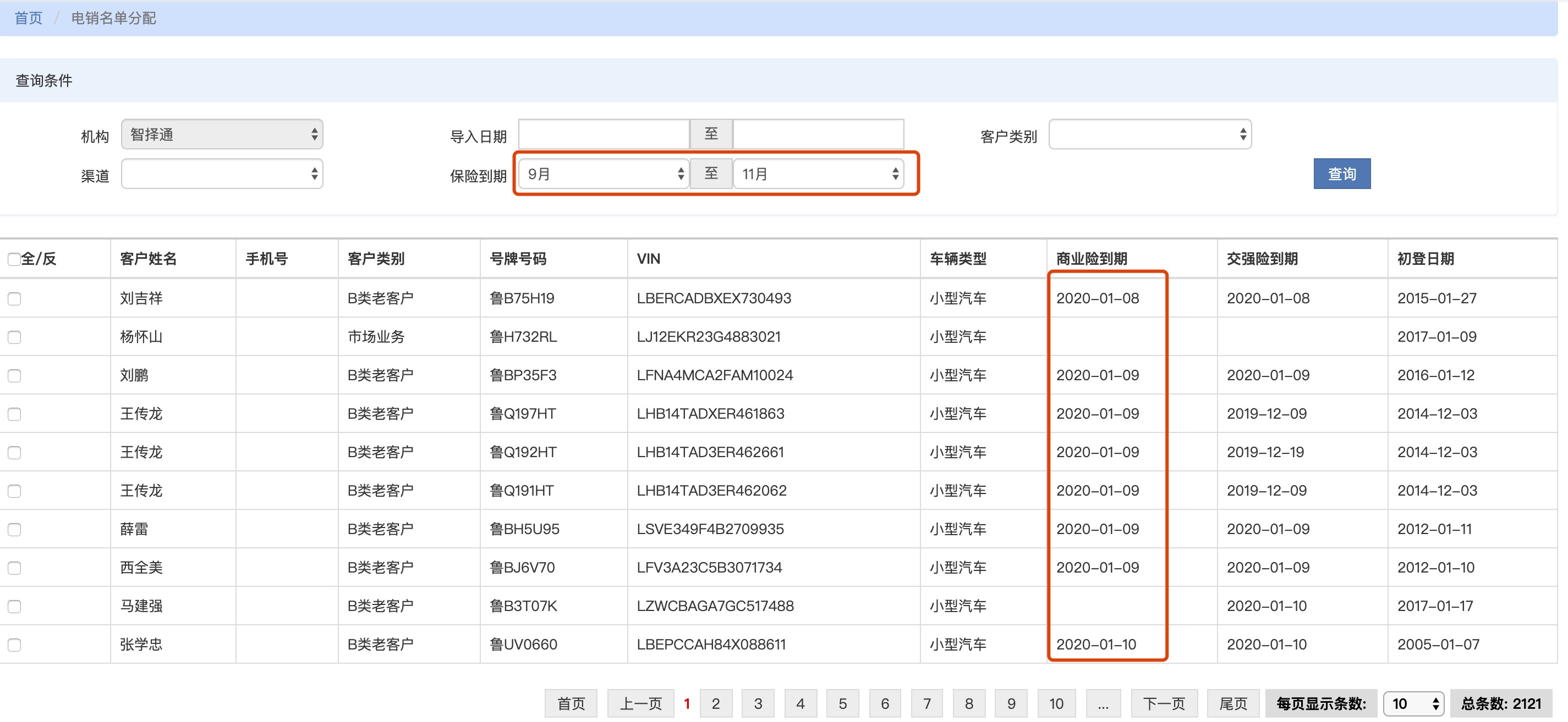 【电销管理】电销名单分配,查询时保险到期时间选定月份,查询的数据有误