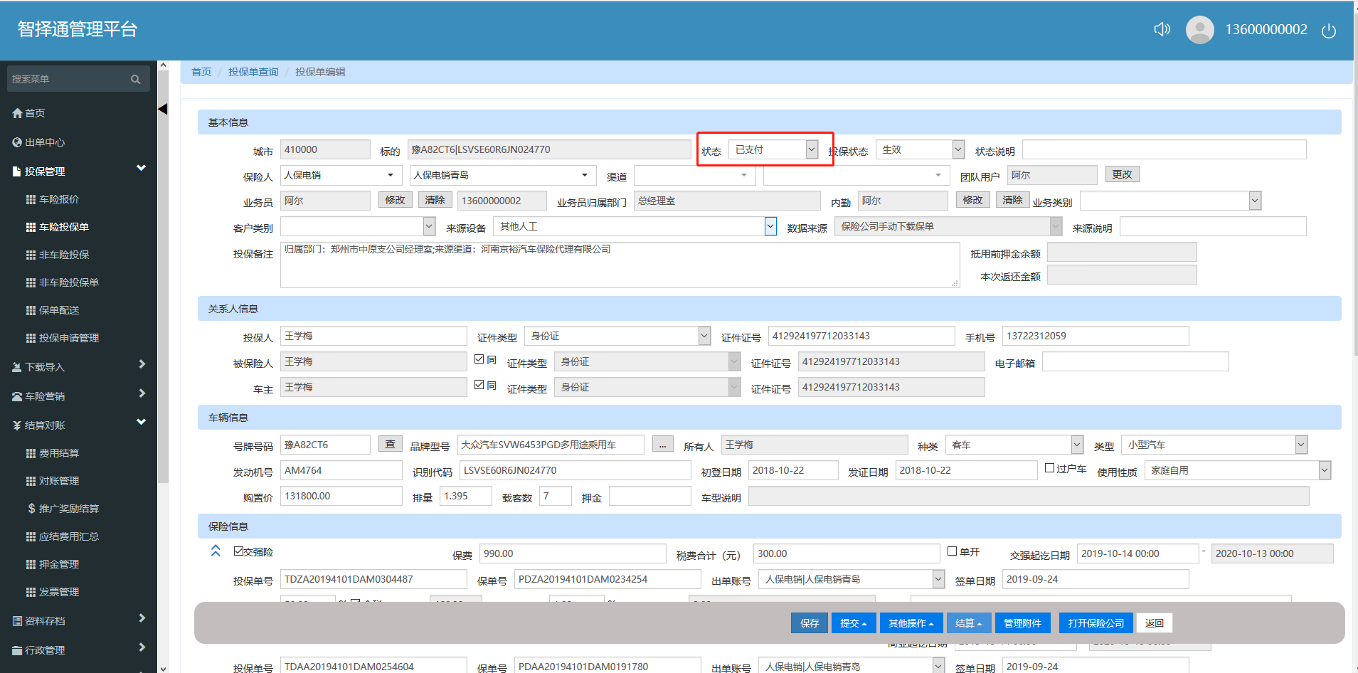 3.把车险和非车险的投保单状态更改为核保通过待支付,