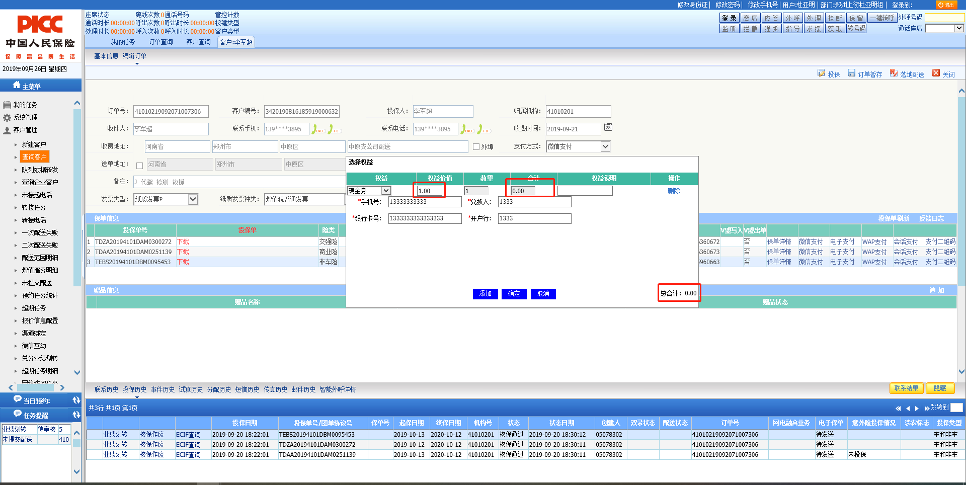选择礼品时权益价值为1.00,但合计和总合计显示0.00,投保单下载成功后在投保单编辑界面礼品显示和选择是一致。