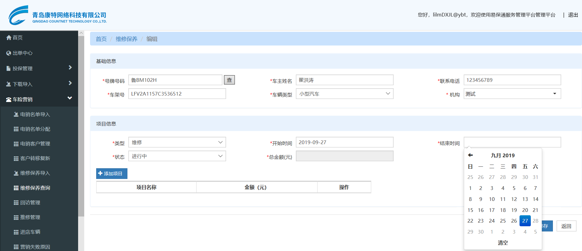 维修保养查询,新增项目信息,结束时间不能选今天之后的日期