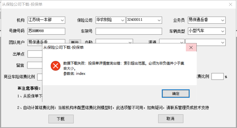 描述:华农下载投保单数据时,系统提示报错“索引超出范围”,如附件所示。