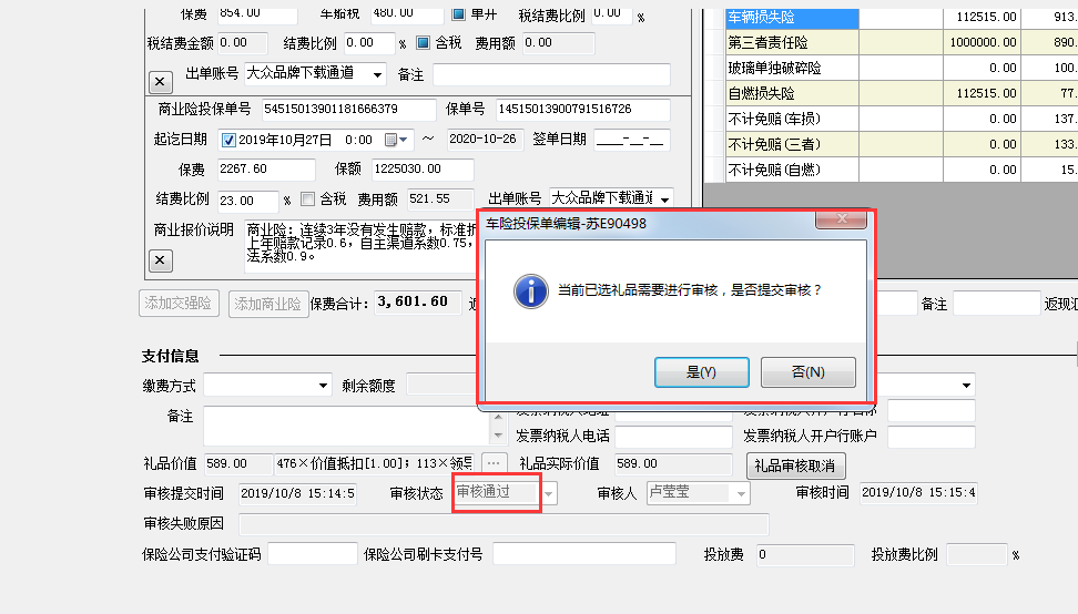 此车提交到核保通过待支付状态时提示需要进行礼品审核,点击确定后,在礼品审核管理功能中出现待审核的礼品审核单,将此单提交到审核通过后,返回投保单中,投保单中礼品状态为审核通过,在此提交投保单状态到核保通过待支付状态后又会给出需要礼品审核的提示,并生成礼品审核单。