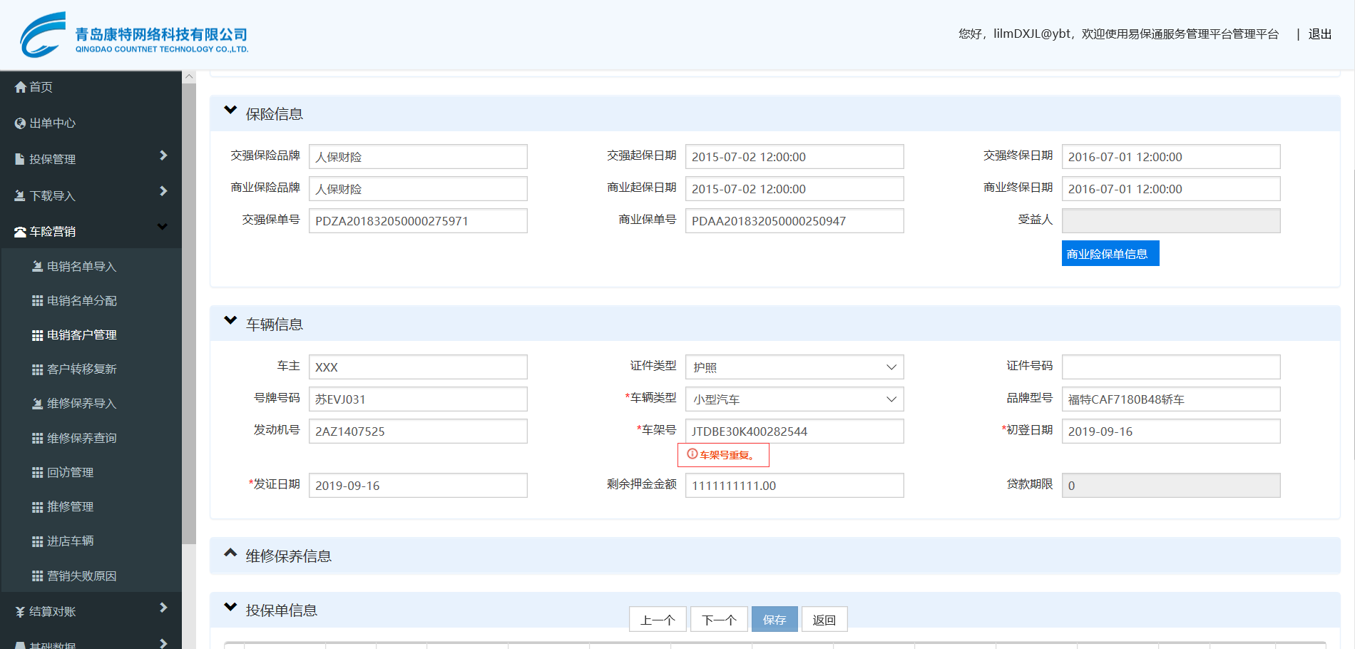 电销客户管理编辑页面,复制车架号提示车架号重复。备注:此车辆 苏EVJ031 JTDBE30K400282544