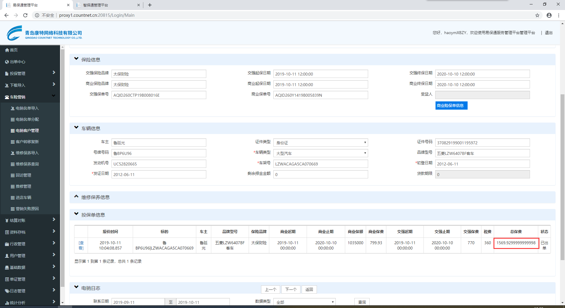 【电销管理】电销客户管理编辑页面,投保单信息总保费应保留小数点后两位数据来源为批量下载保单更新电销名单