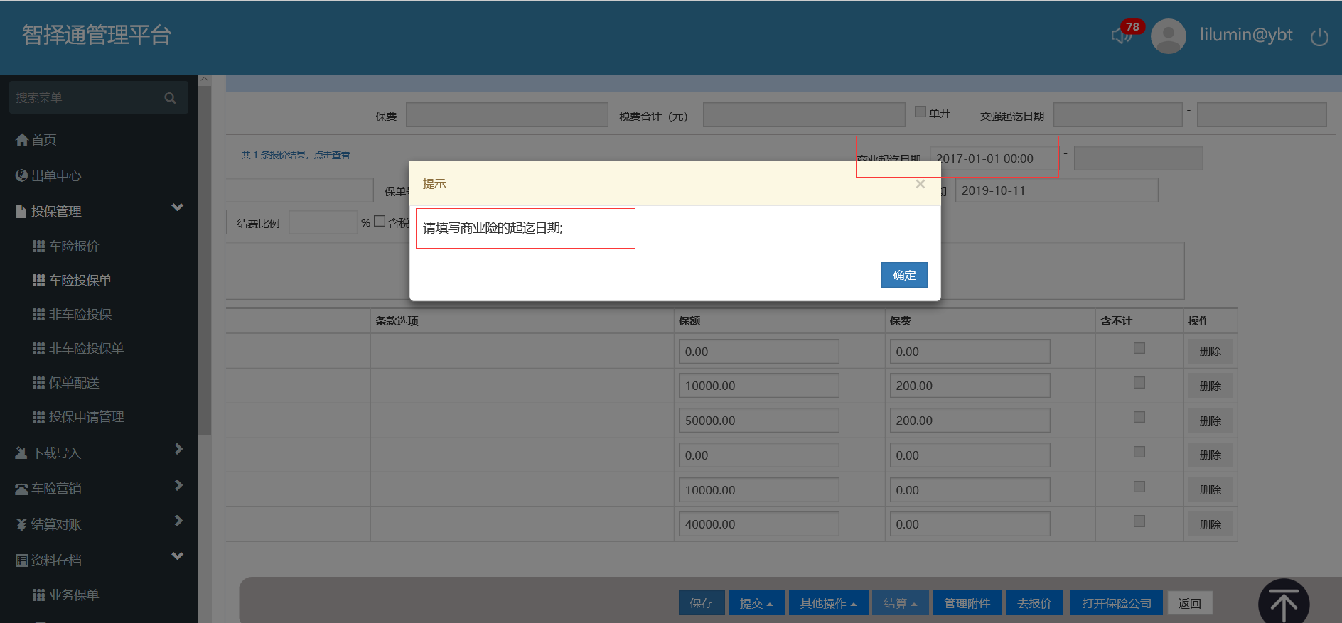 - 主题 从 【测试环境】新建投保单提交到已报价时,存在商业起止日期,提示请填写商业起止日期 变更为 【测试环境】新建投保单提交到已报价时,存在商业开始日期,未带入商业终止期,提交时提示请填写商业起止日期