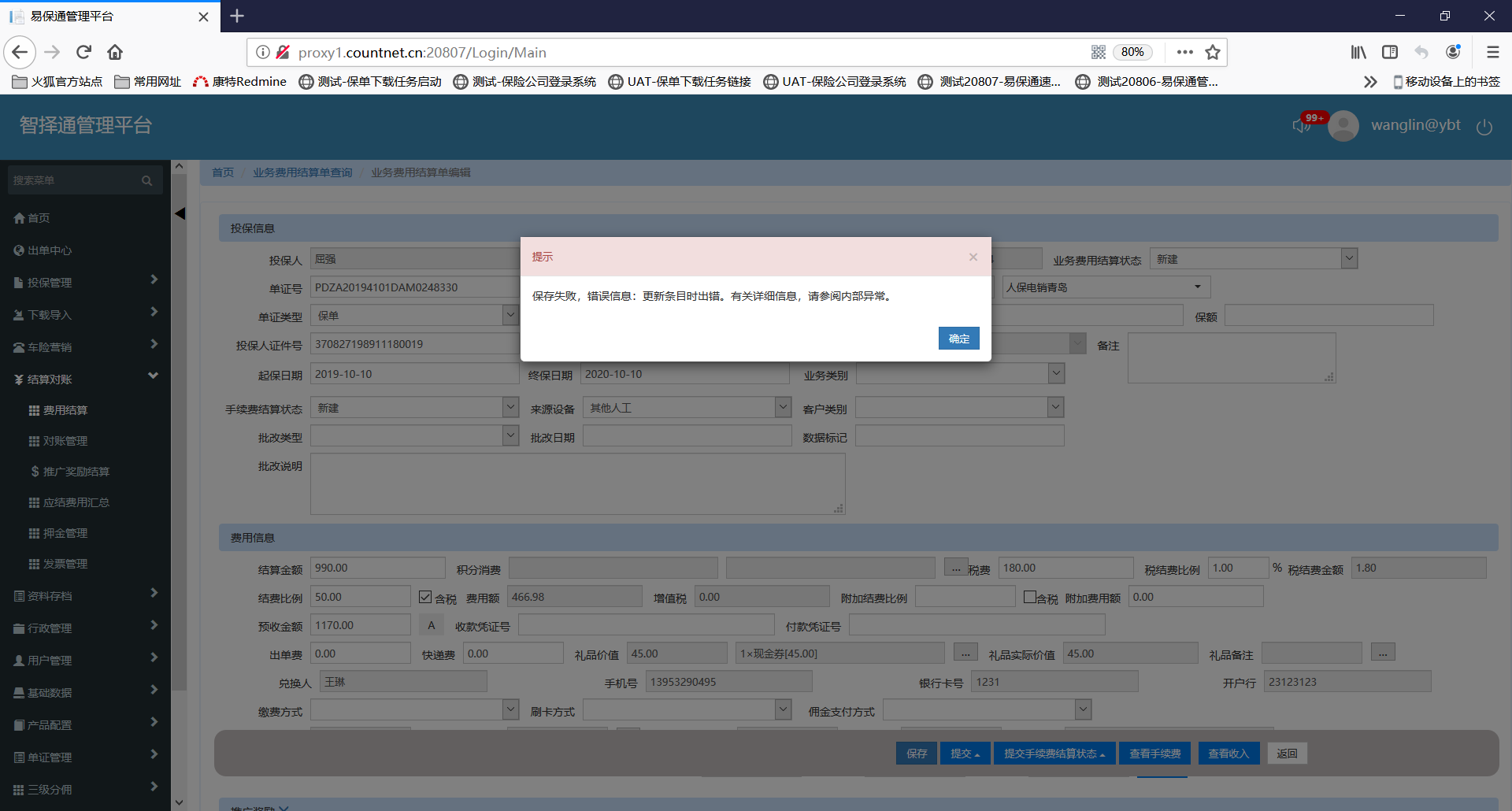 【出单中心2.0-人保电销】结算单保存时报错,报更新条目出错,见附图