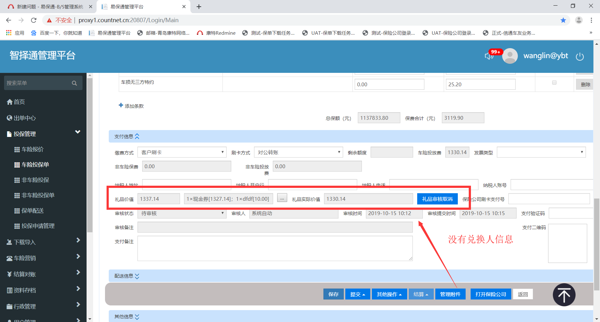 【出单中心2.0-人保电销】在礼品审核管理中,选择有现金券的礼品,点击更改礼品按钮,不作任何更改点击保存按钮,再次查看该条礼品时,兑换人的信息被清空了