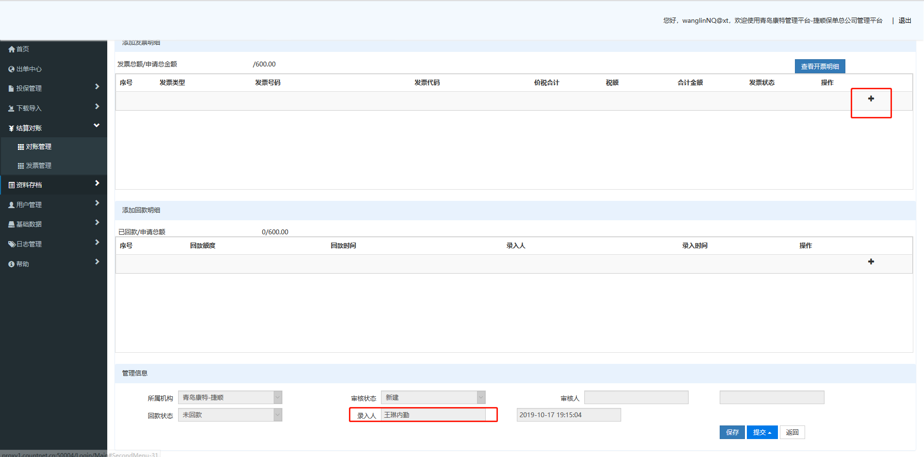期望:内勤不允许添加发票明细,加号按钮隐藏(现在内勤权限和财务权限几乎一致,权限问题要仔细看下)