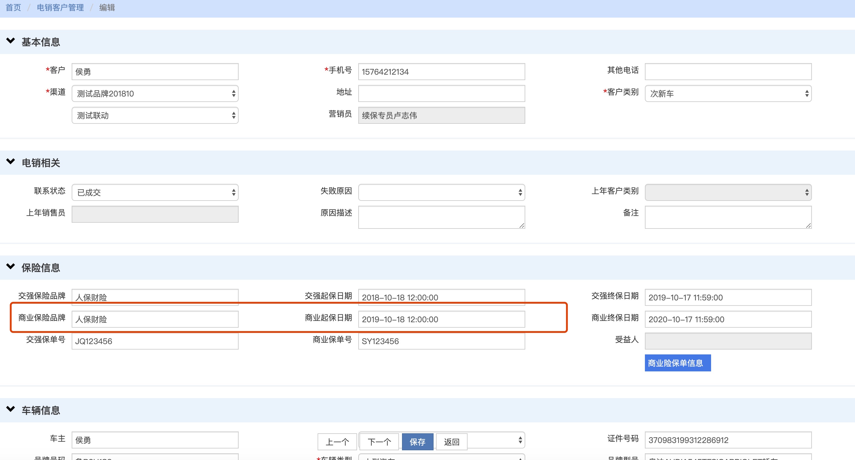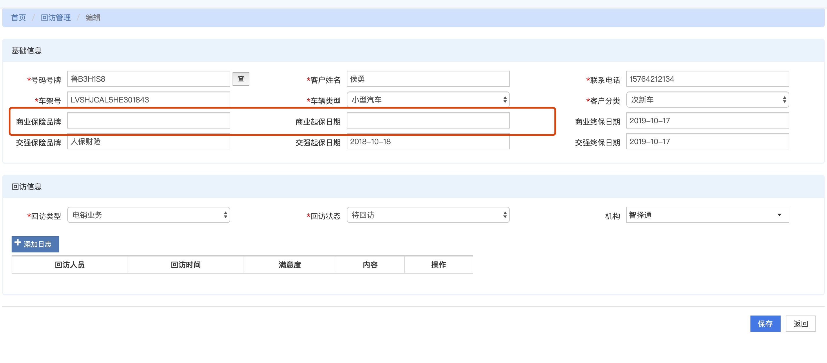 【电销管理】回访管理,电销客户管理已成交后自动生成回访记录,记录中商业保险品牌和商业起保日期未同步