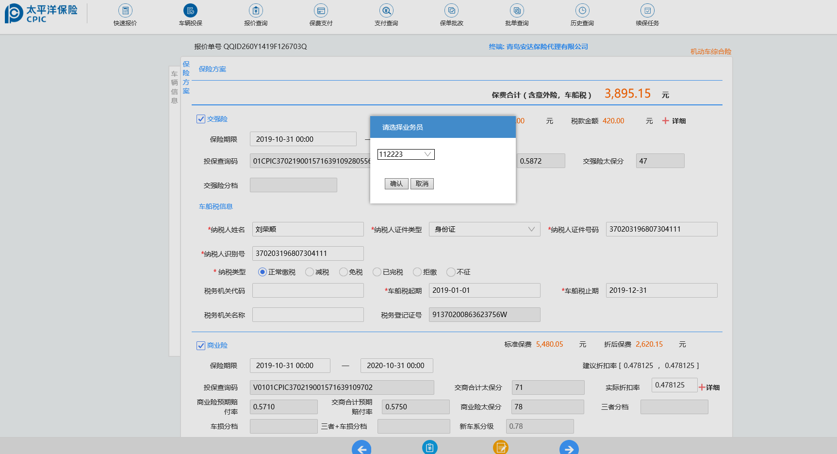 【出单中心2.0新太保】在投保单中点去报价进入保险公司系统,在保险公司系统中保费试算后点击暂存,选择仅下载会提示选择业务员(选择是不会有选择业务员提示)。