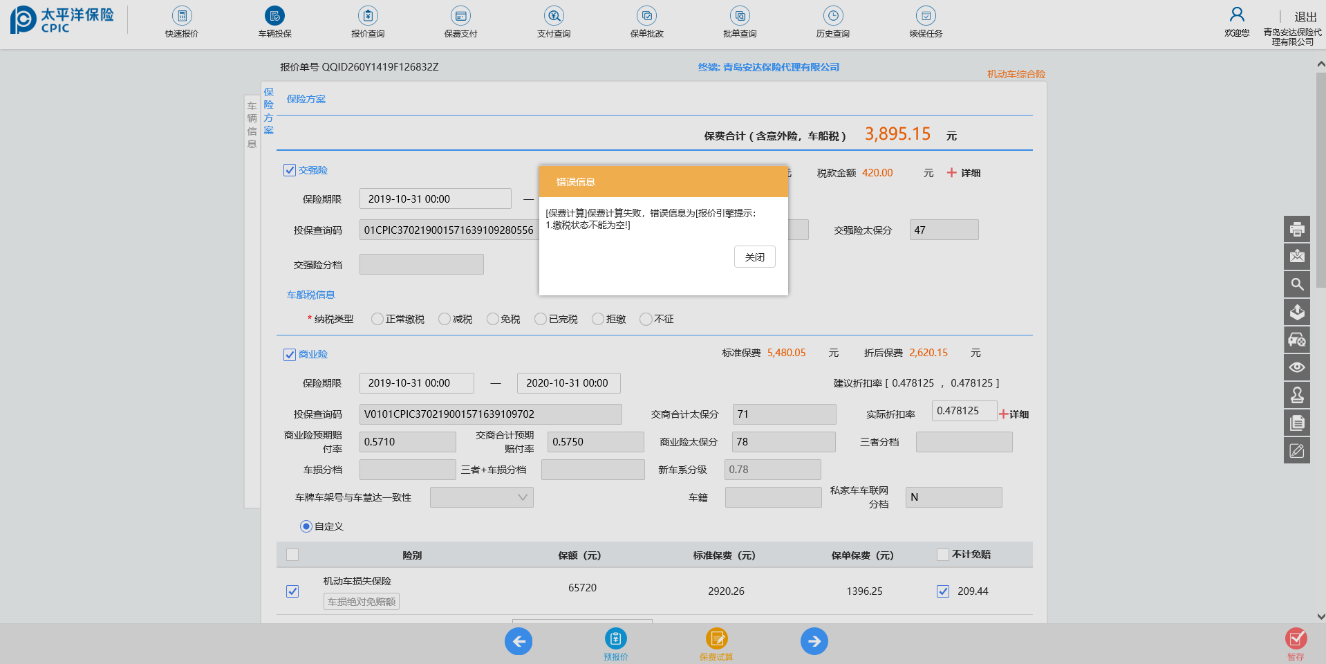 【出单中心2.0新太保】点“打开保险公司”按钮打开保险公司系统进行报价,在快速报价界面保费试算后转投保在保险方案界面再点保费试算,关闭提示后仍然会提示是否下载投保单。
