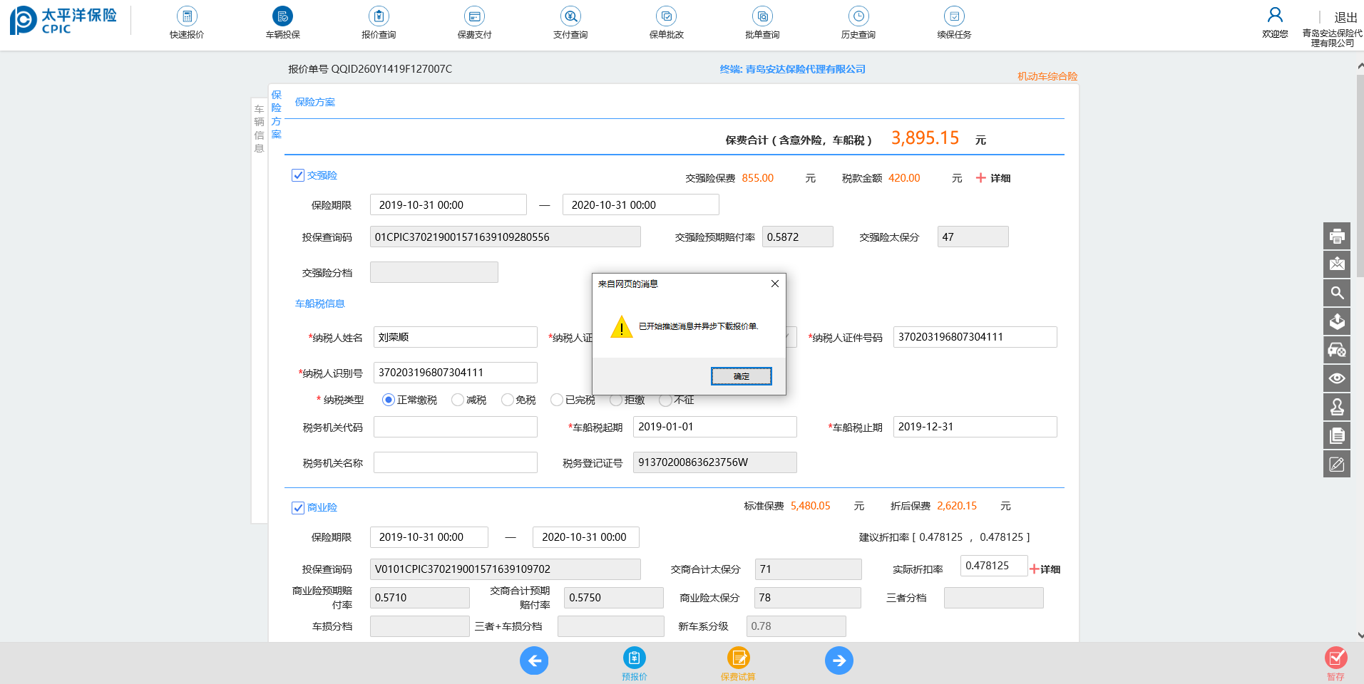 【出单中心2.0新太保】在管理系统中点‘打开保险公司’进入保险公司系统进行报价,保费试算后点击暂存,选择是不会有提示选择业务员。