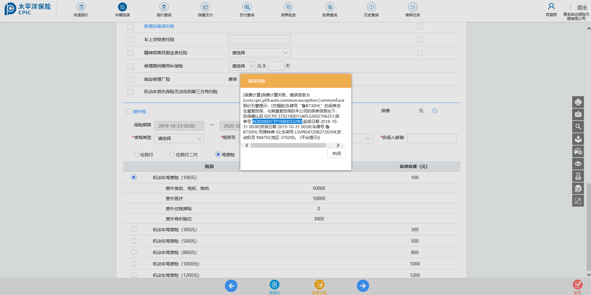 【出单中心2.0新太保】管理系统中新建投保单,填写车辆信息、车主、投保单人信息完整的数据点击去报价,保费试算时提示发生重复投保。