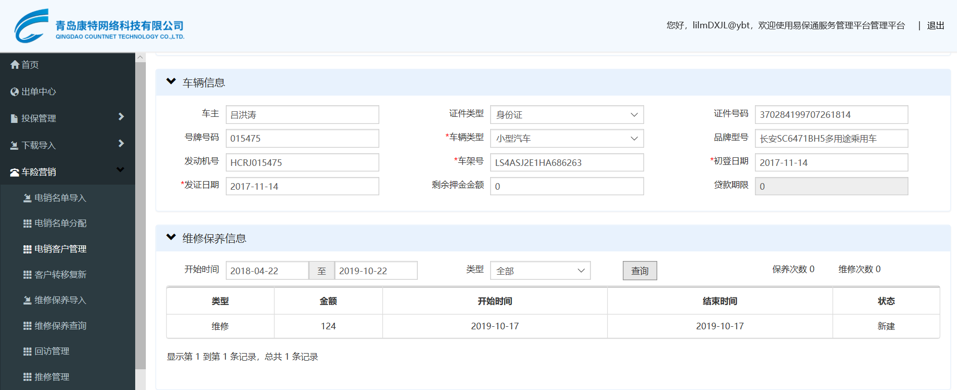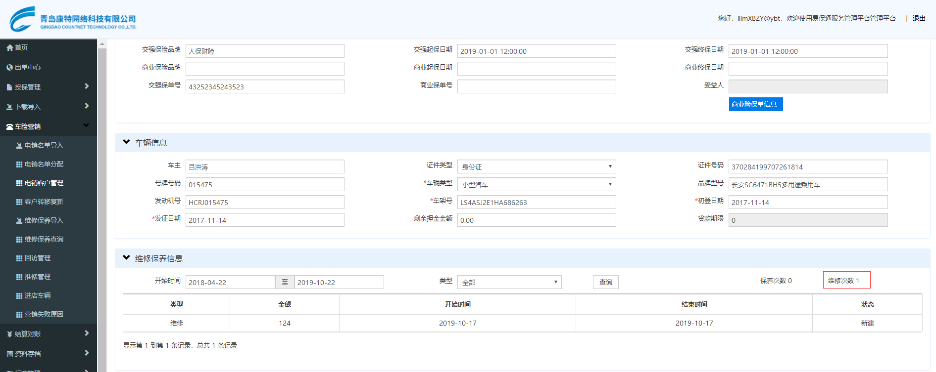 选择一条有维修保养信息的数据进行复新,复新前后电销客户编辑页面,维修次数统计不一致