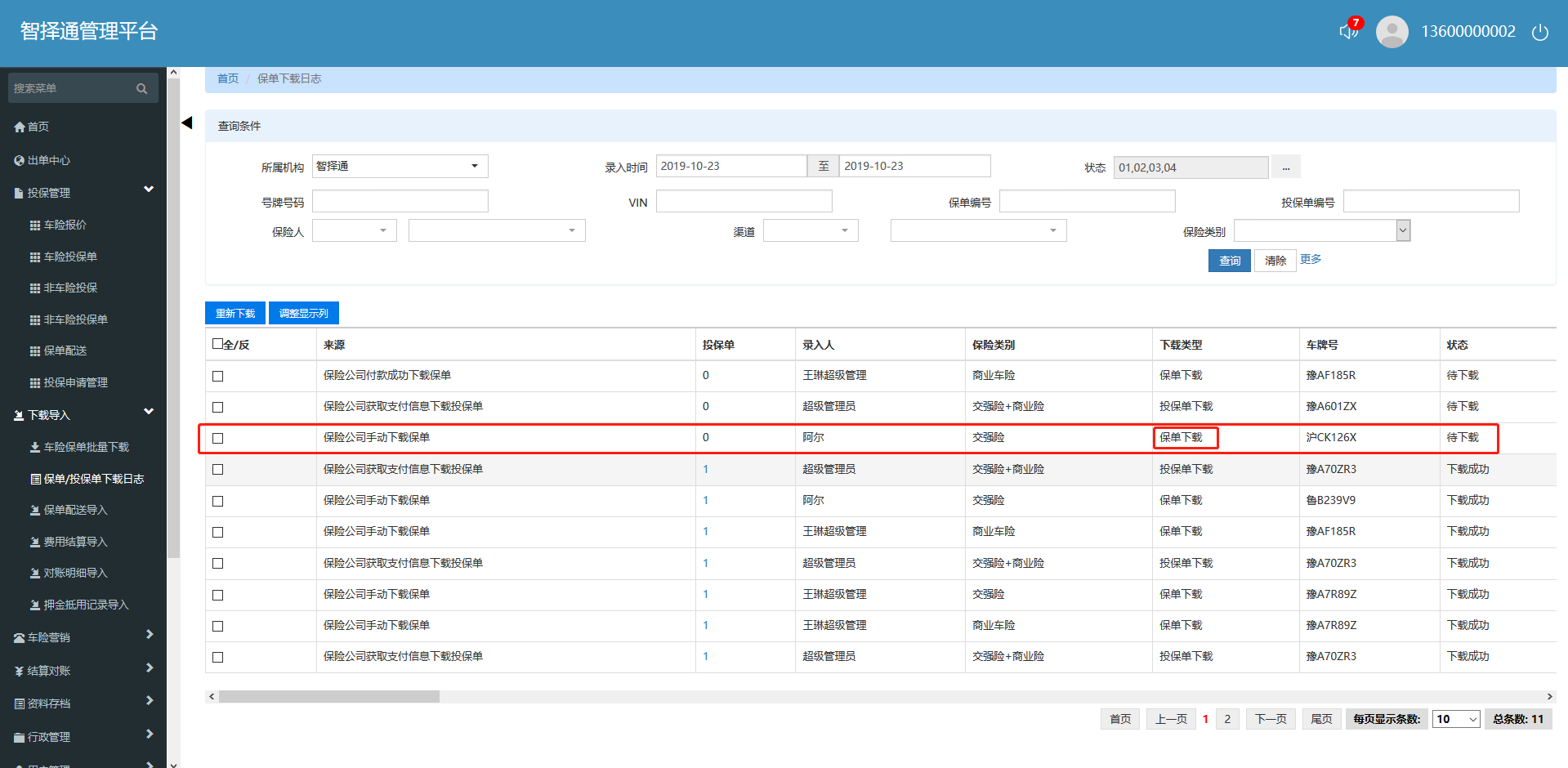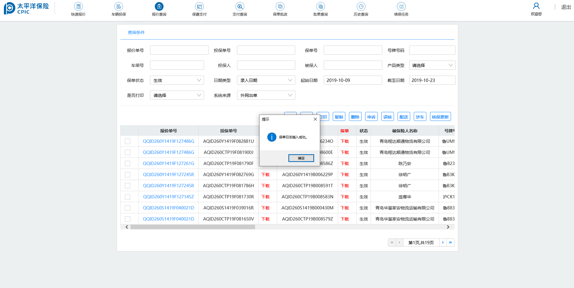 【出单中心2.0新太保】便捷下载,点击投保单的下载按键(有保单号且状态为生效),出单中心提示的是‘保单日志插入成功’,且在下载日志中显示的也是保单下载。