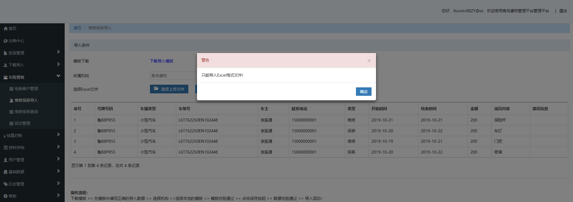 维修保养导入,选择Excel格式文件上传,提示只能导入Excel格式的文件