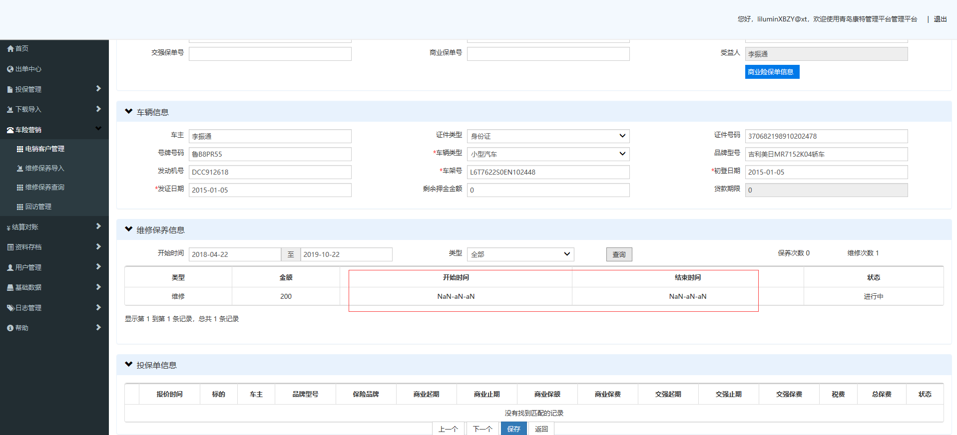 电销客户管理编辑页面,存在维修保养信息,开始时间和结束时间显示NaN-aN-aN