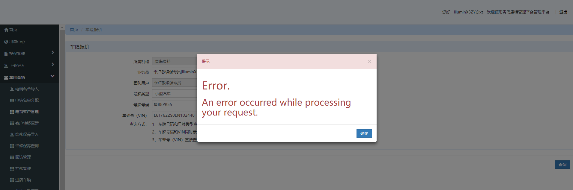 电销客户管理界面,点击报价进入车险报价界面,点击查询提示错误