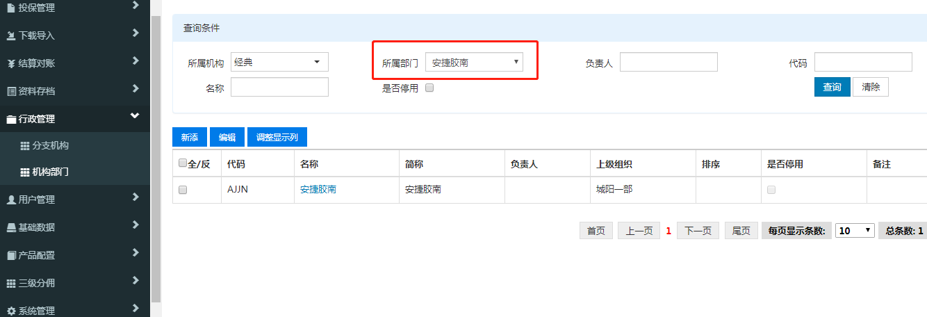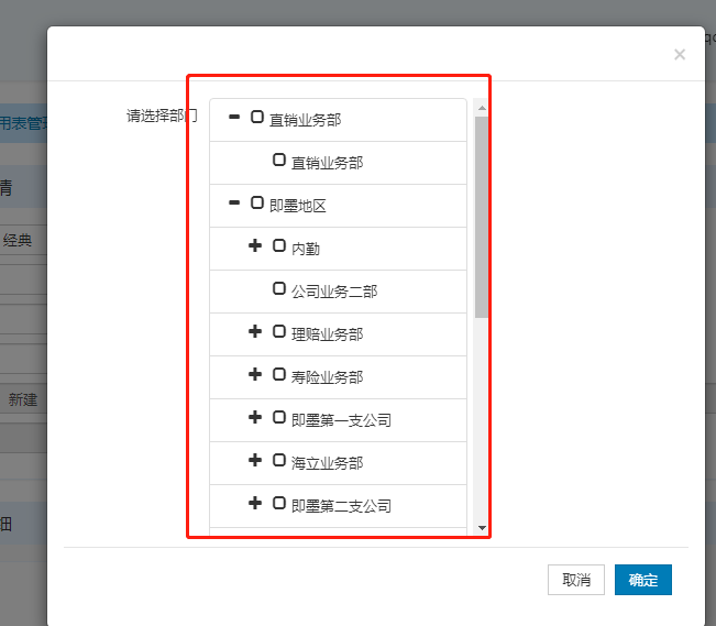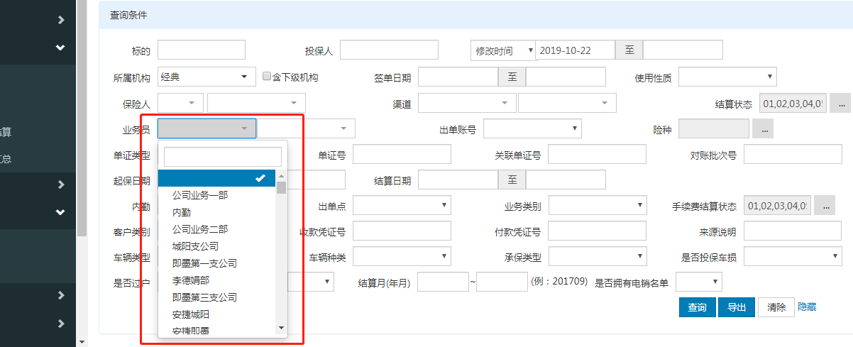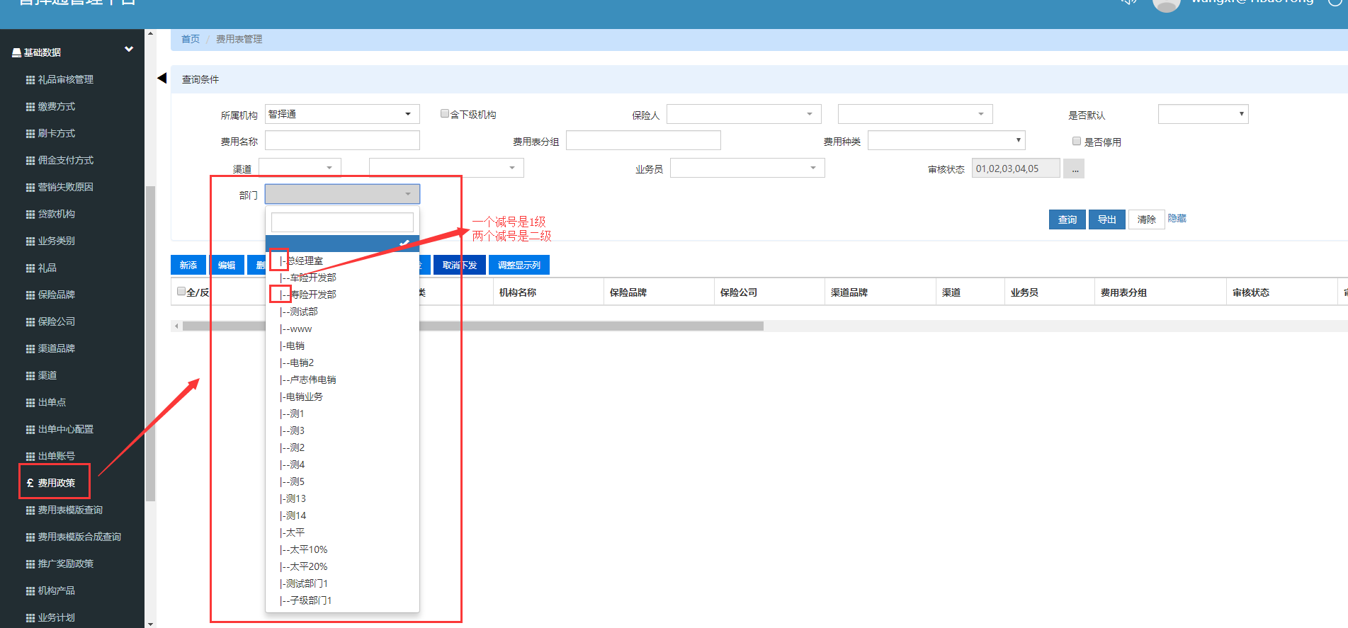 “机构部门”“费用结算”等页面查询条件中的所属部门、业务员两个查询条件中下拉框中的部门数据需按部门层级分类。