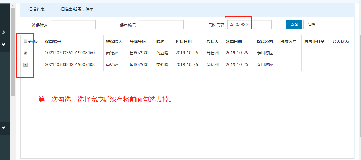 【经典】车险保单批量下载功能中,通过“扫描列表--号牌号码”功能进行筛选时,第二次筛选时,需要将第一次筛选的结果之前的勾选去掉之后才能重新进行勾选。
