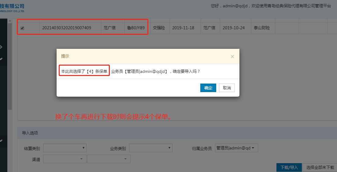 例如:筛选结果中先筛选鲁B12345,勾选了两个保单后点击下载,重新筛选鲁B54321,如果第一次筛选时选择的鲁B12345未取消勾选,那么在筛选鲁B54321时则会提示选中四个保单。