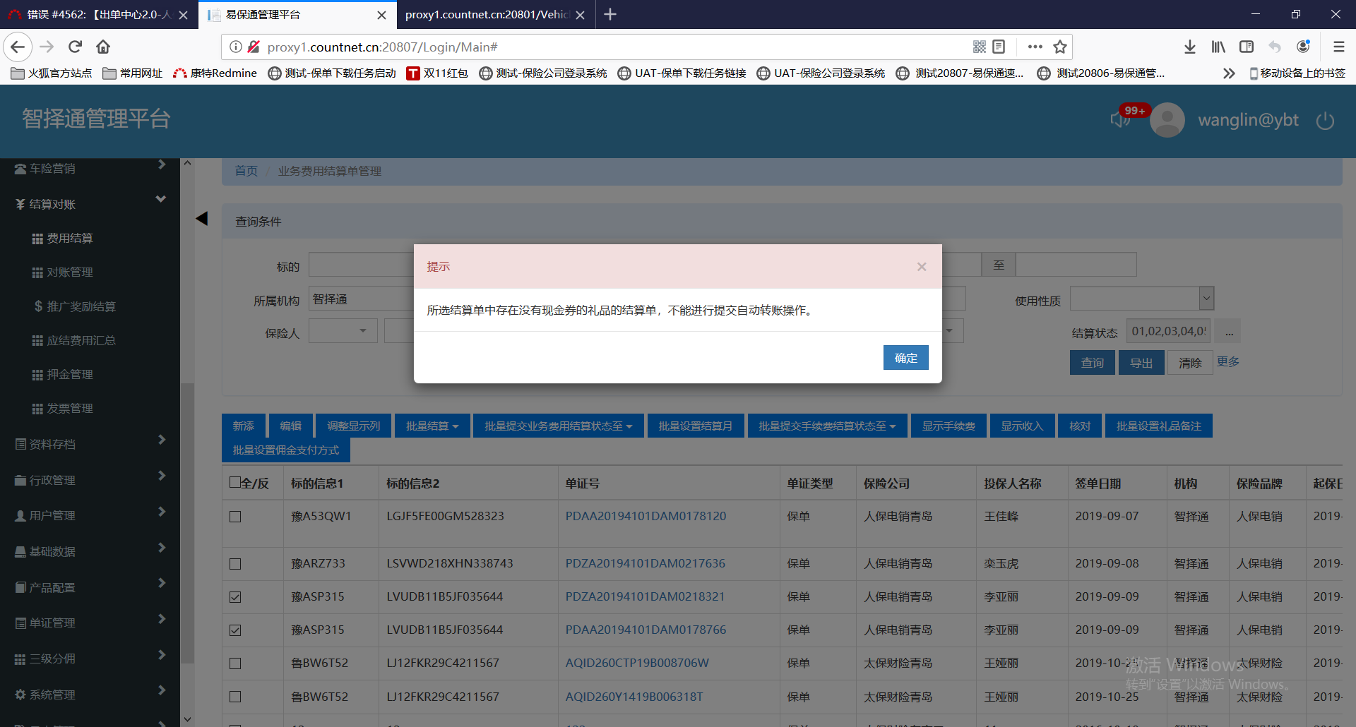 【出单中心2.0-人保电销】结算单的列表页,选中结算单批量提交到任何状态时,都会出现如图提示。应该只有提交自动付款的时候才会判断此逻辑