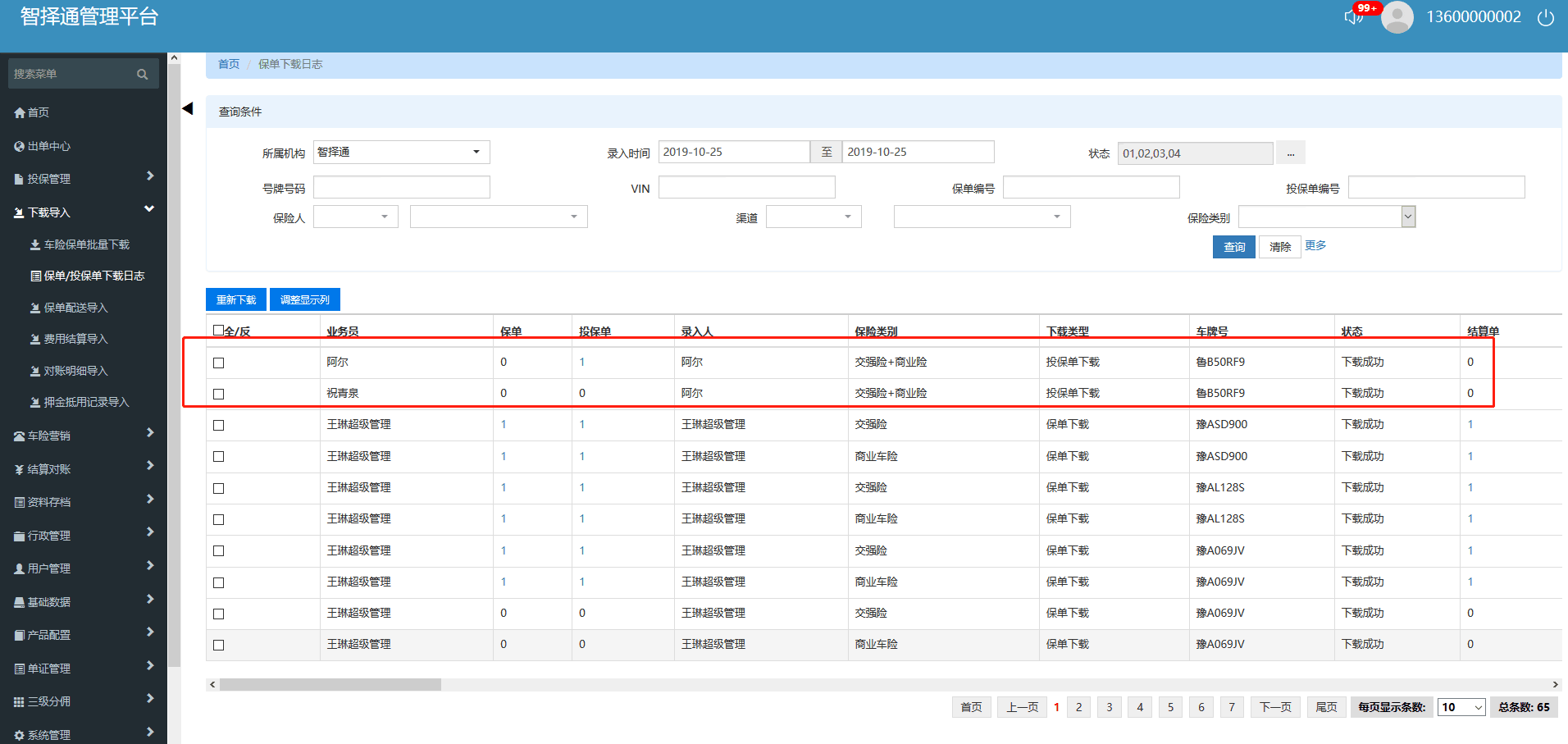 【出单中心2.0新太保】多次下载投保单(报价、核保通过、申请支付等下载),下载时选择不同的业务员,在保险公司删除报价单,在管理系统中只会删除第一个业务员的投保单。