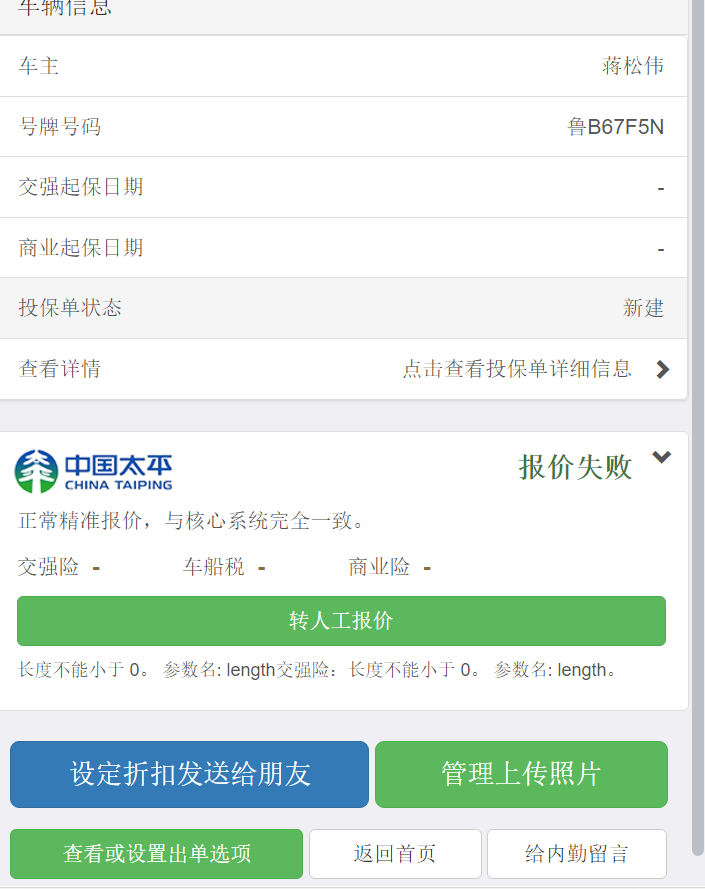描述:上述车使用海林微信公众号选择太平财险报价时,系统报价失败给出的错误提示为“参数名: length交强险:长度不能小于 0”。报价过程中的起保日期默认第二天,选择的条款为三者100万和车损,选择其他车型也一并报错。