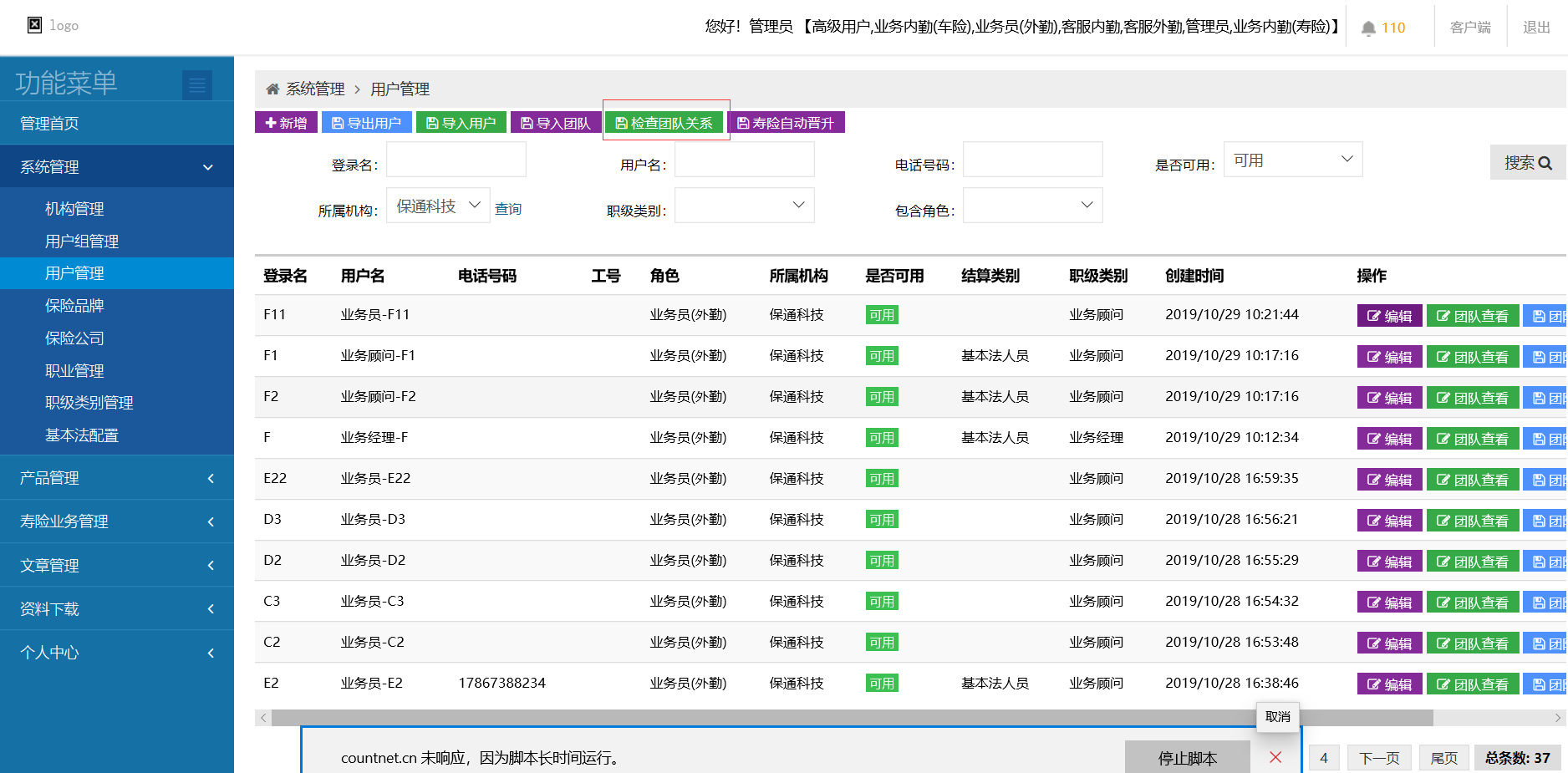 点击检查团队关系,页面无反应实际运行脚本,应不可操作其他功能