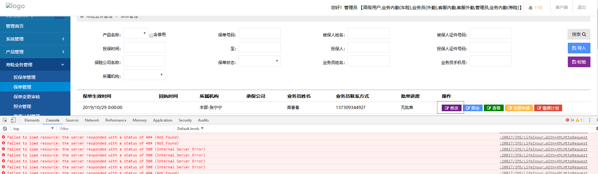 【寿险业务管理】保单管理,点击修改按钮无反应,后台报错
