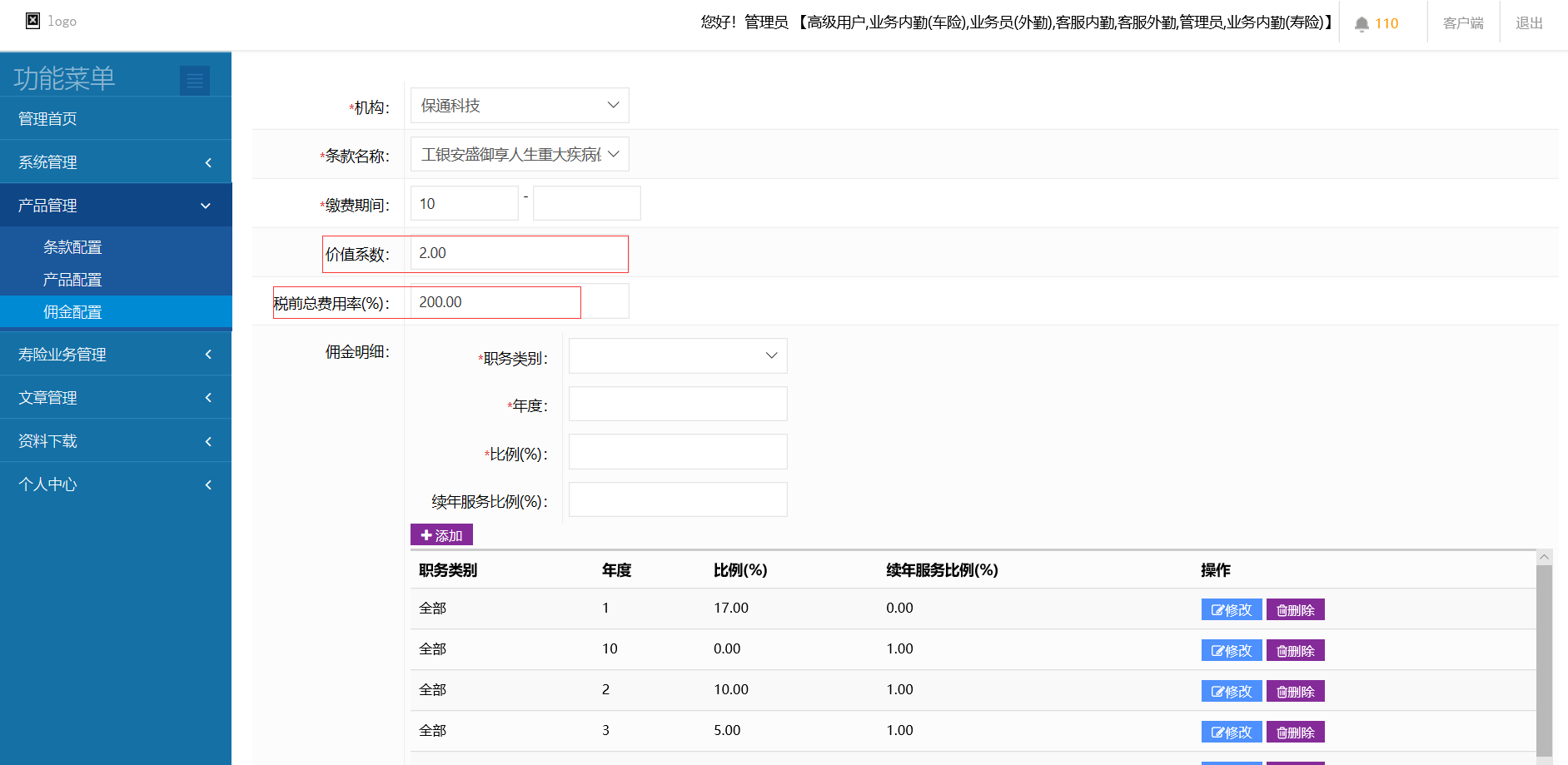 佣金配置新增界面,价值系数和税前总费用率最大值应为1,大于1保存时应有提示