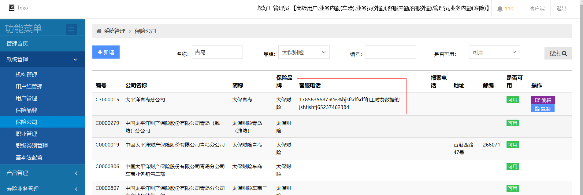 【系统管理】保险公司,管理界面显示客服电话,编辑页面显示报案电话显示不一致