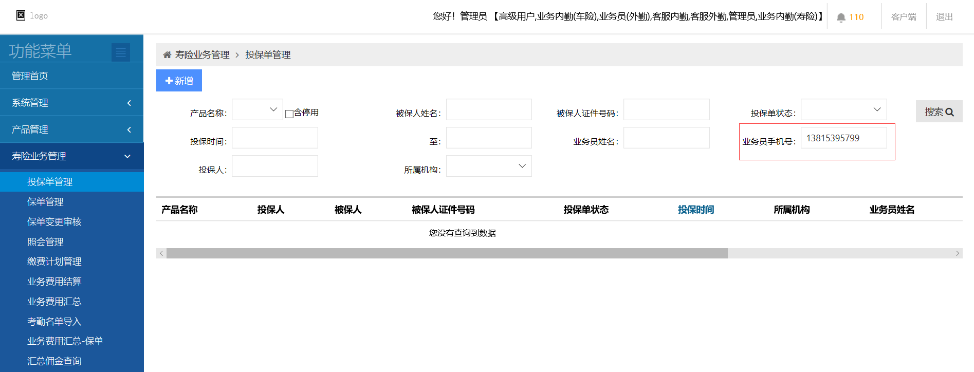 投保单管理,根据业务员手机号查询不到数据缴费计划管理同样输入手机号查询不到数据