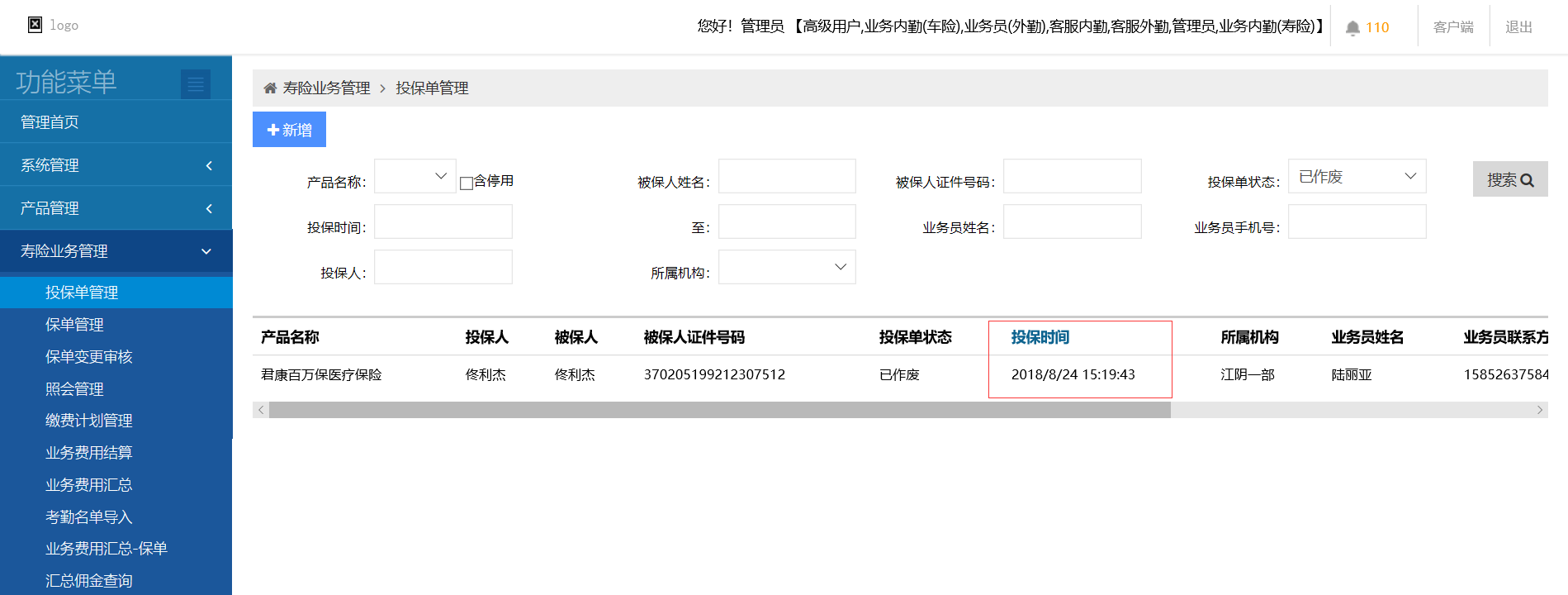 投保单管理,已作废状态查询到一条数据,点击投保时间,无数据显示