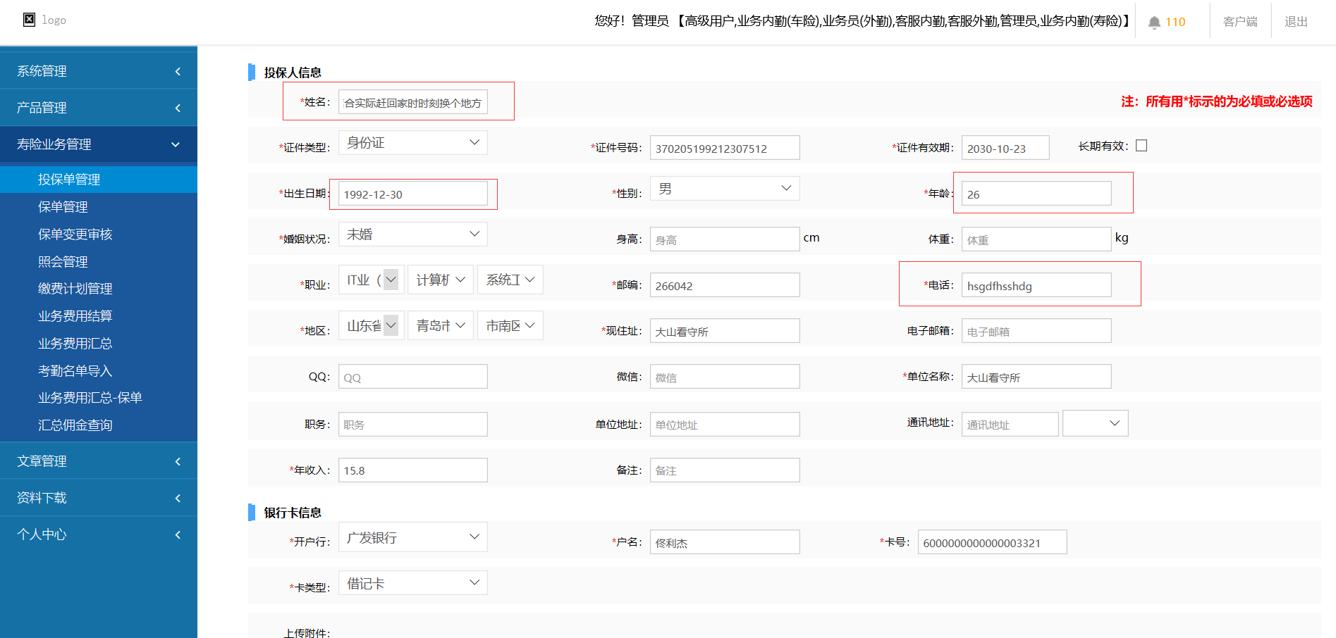 投保单编辑页面,年龄与出生日期不符姓名输入框无长度限制电话输入各种类型时未提示,点击下一步可触发提示格式不正确