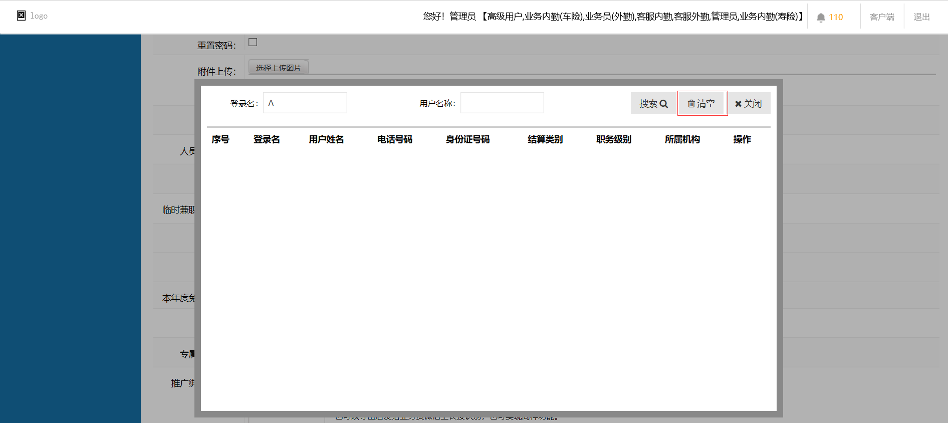 用户管理,用户管理编辑界面推荐人查询,输入登录名查询,点击清空关闭该页面,应清空输入信息