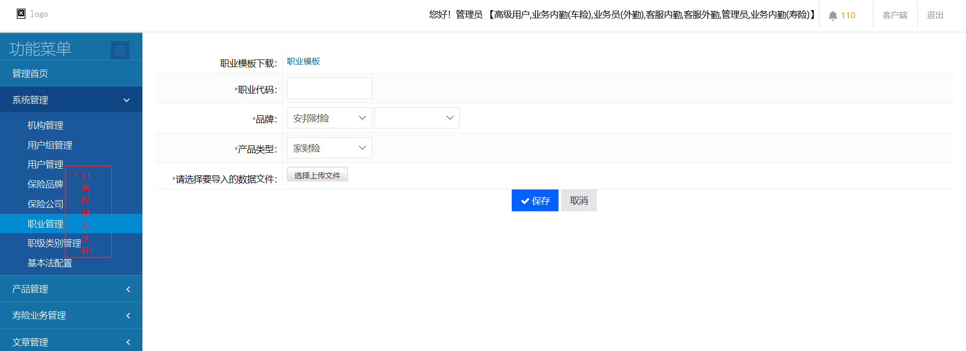 职业管理,职业管理导入,填写完信息后未选择上传文件点击保存,提示位置不正确