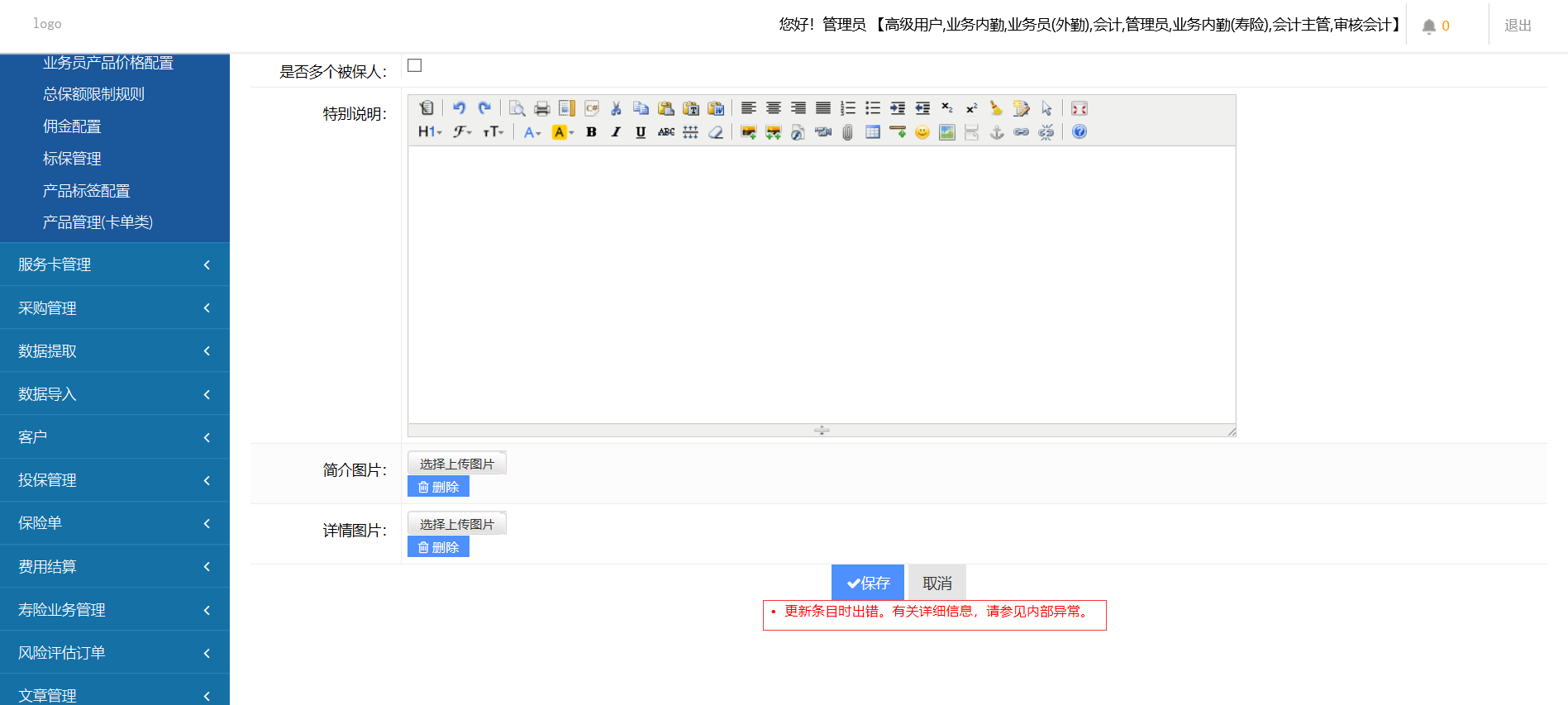 【青岛融安-产品管理】产品配置,填写信息后保存,提示更新条目时出错