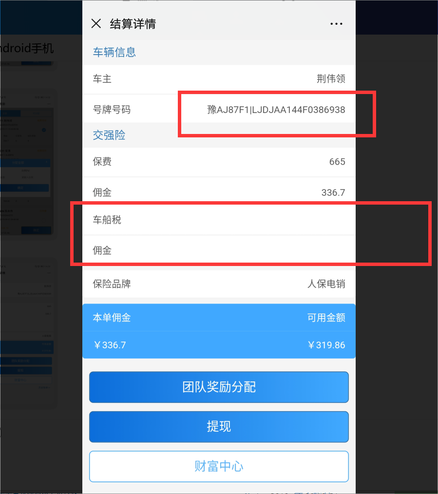1. 交强险的结算单,不显示车船税及佣金2. 车牌号显示的是标的信息,应该显示车牌号