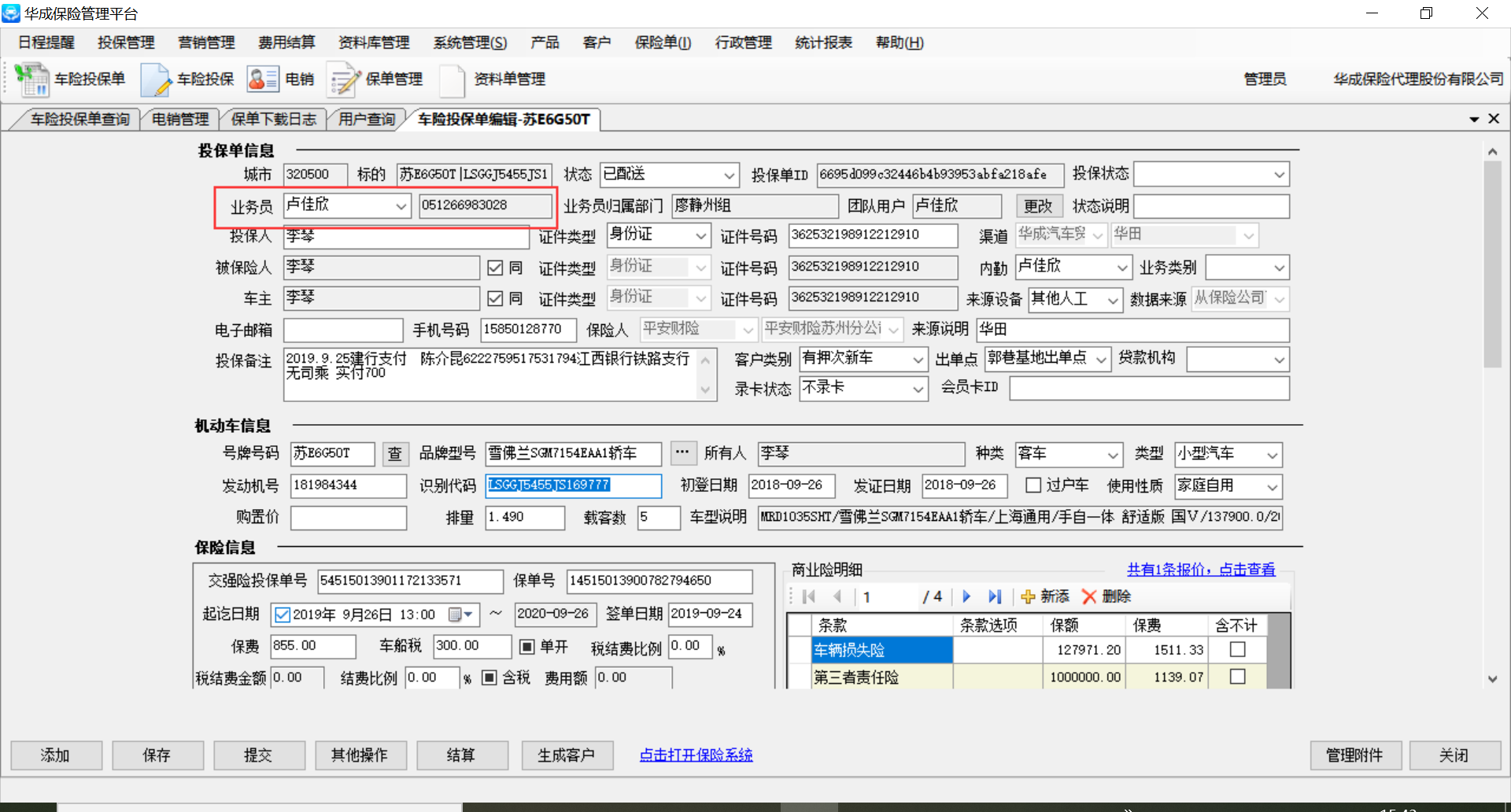 【苏州华成】投保单业务员与电销名单内的营销员不一致