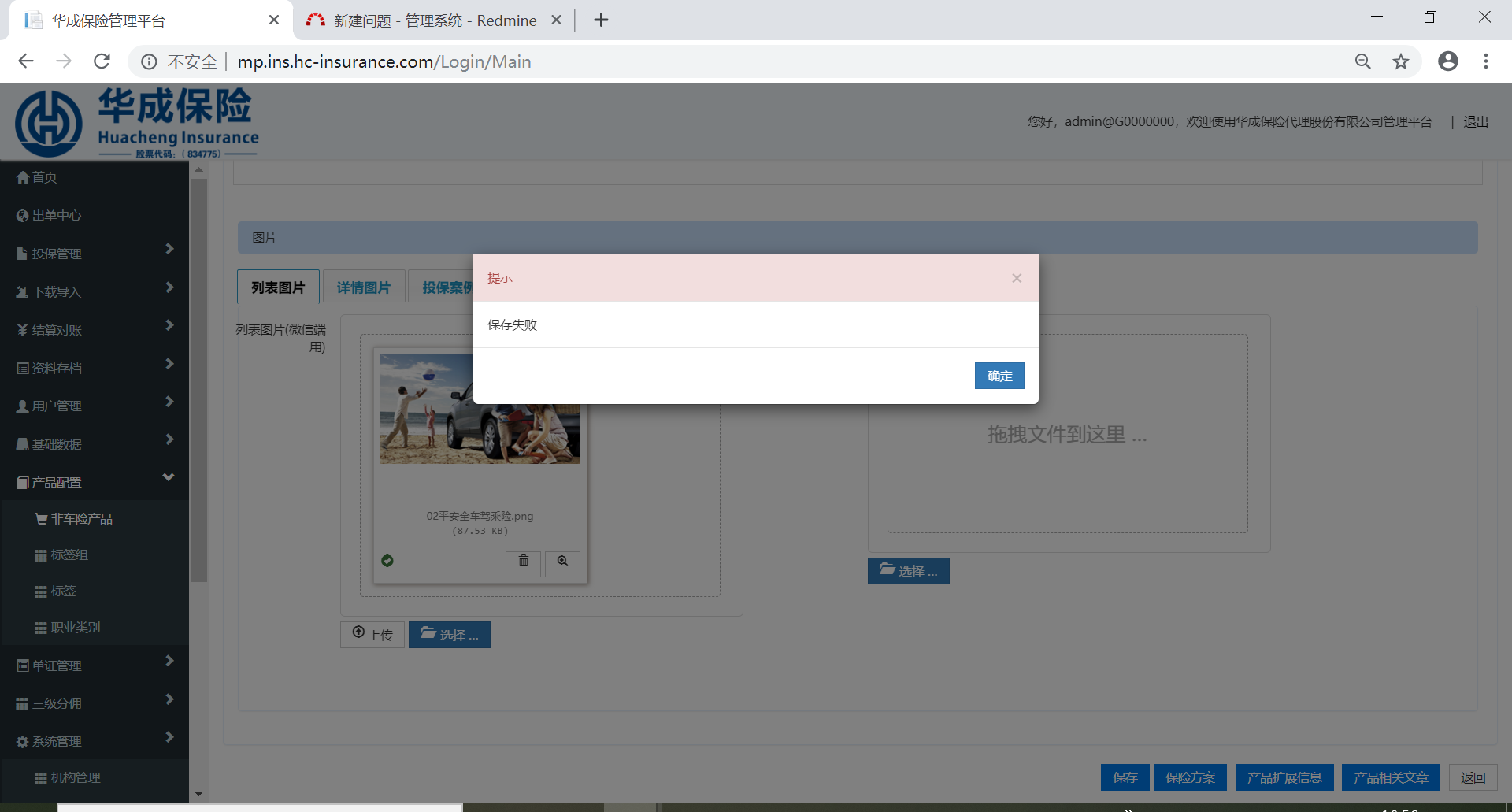 描述:产品配置——非车险产品页面中进入平安驾意险上传列表图片后,点击保存系统提示“保存失败”。