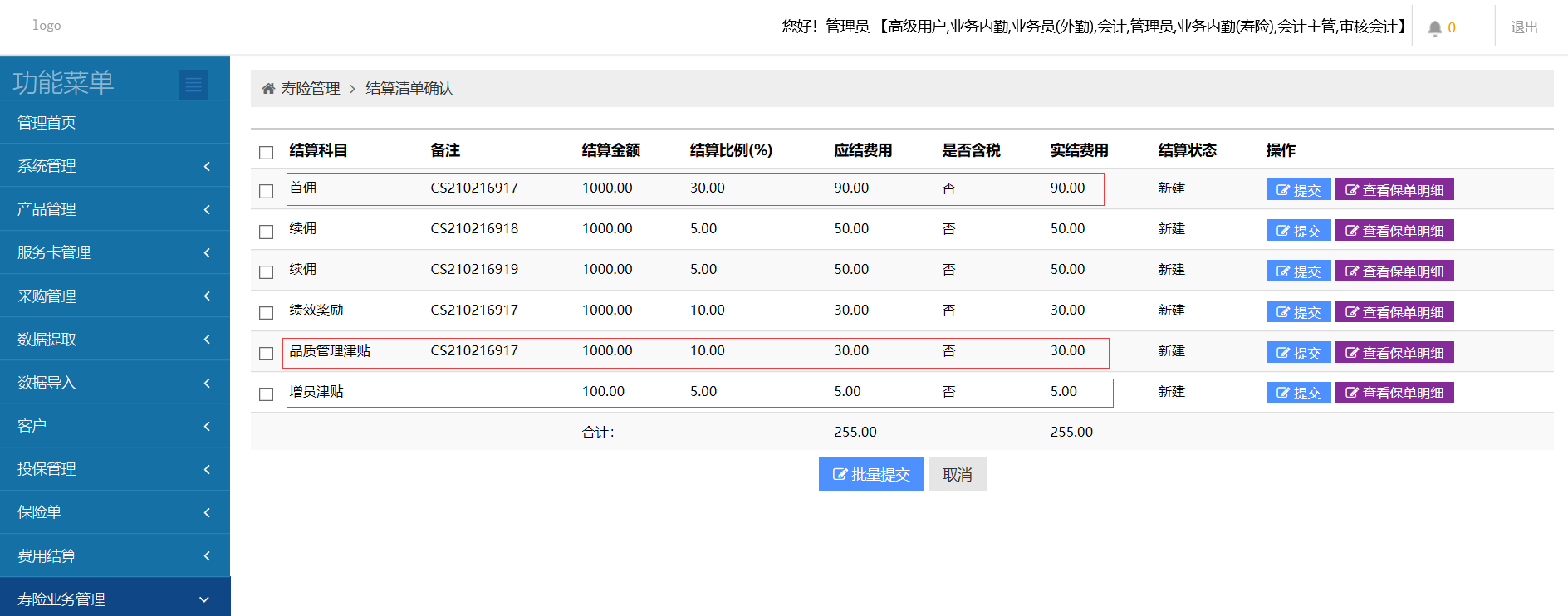 *【寿险业务管理】业务费用汇总,选择一条数据,结算清单,首佣、品质管理津贴、增员津贴基本法错误