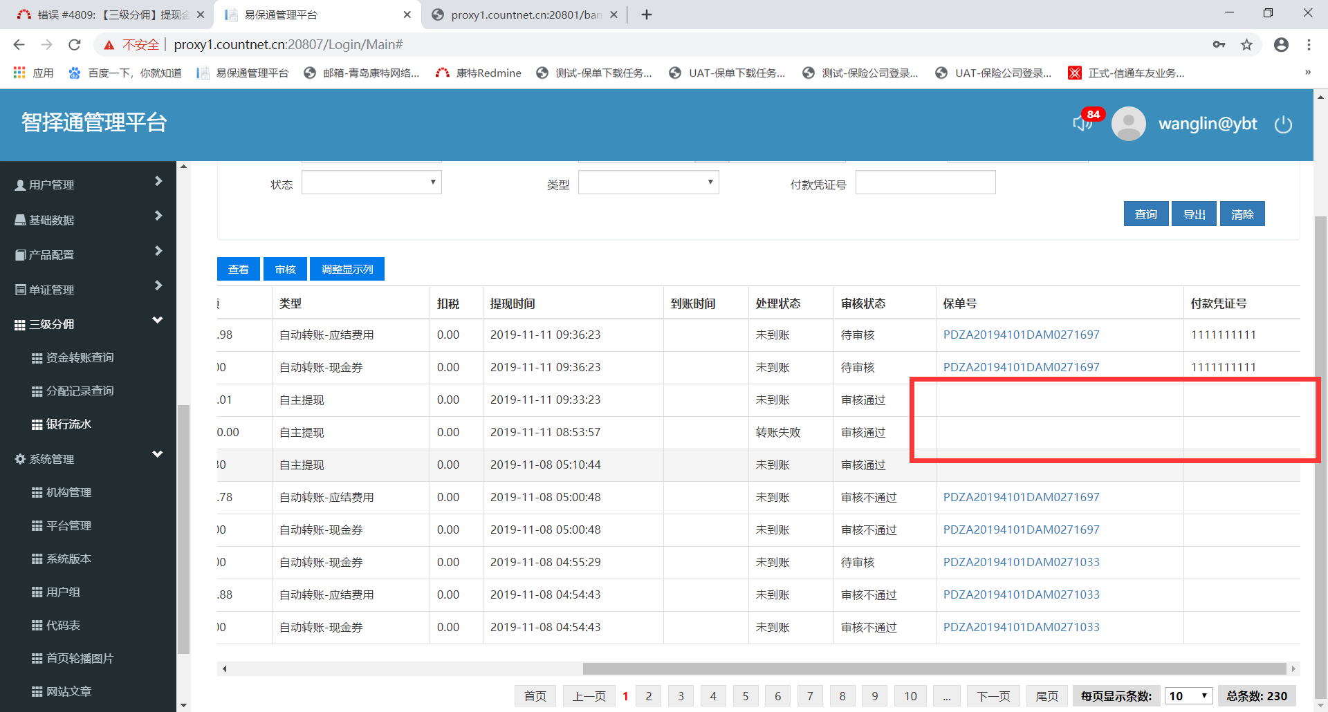 原因:保单号未关联显示,付款凭证号是佣金代付使用的,自主提现这个地方没有用处,所以不用显示解决方案:保单号显示(最多显示三个,因为有可能太多无法显示),付款凭证号不显示