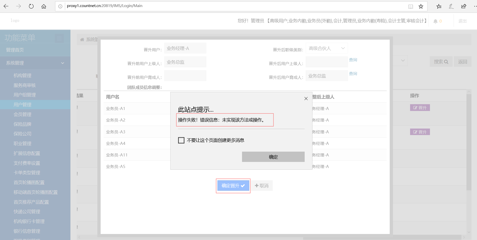 【青岛融安-系统管理】用户管理,寿险自动晋升,符合晋升条件点击晋升时提示未实现该方法