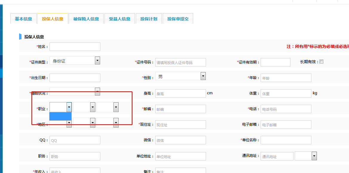 在录入投保单的时候,选择职业时没有默认值。