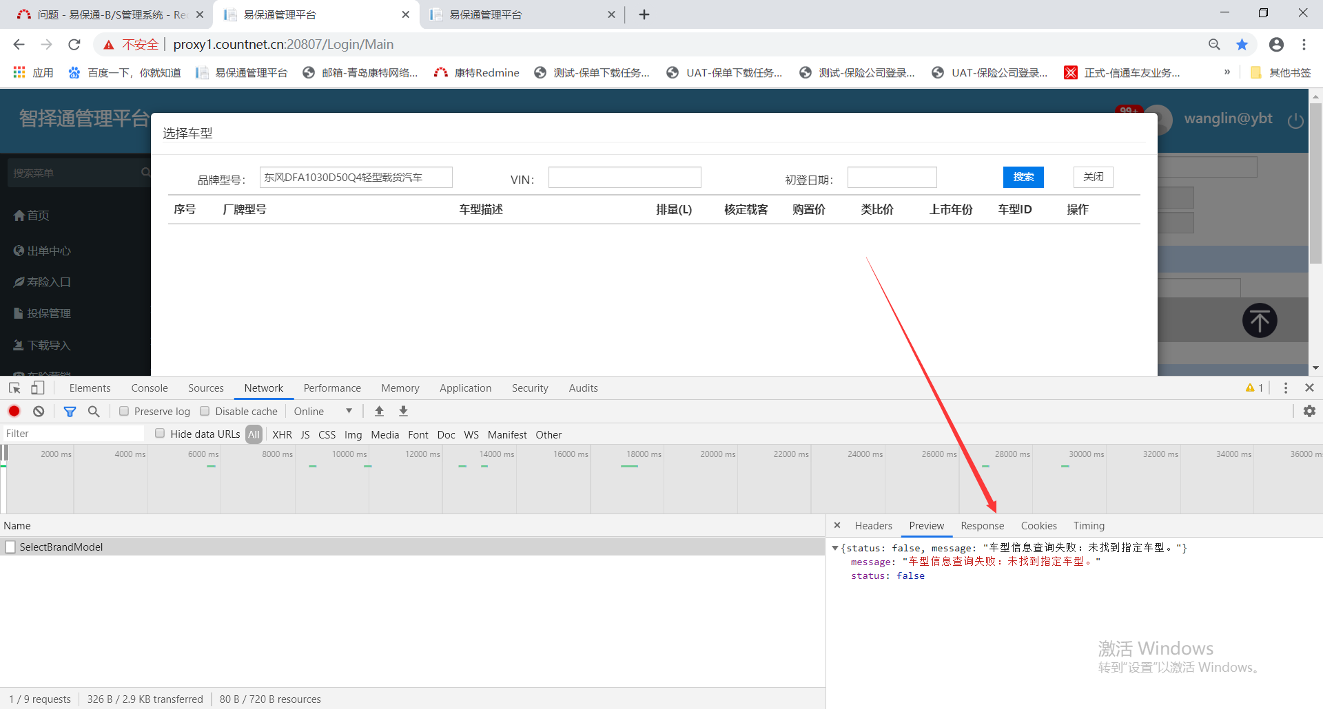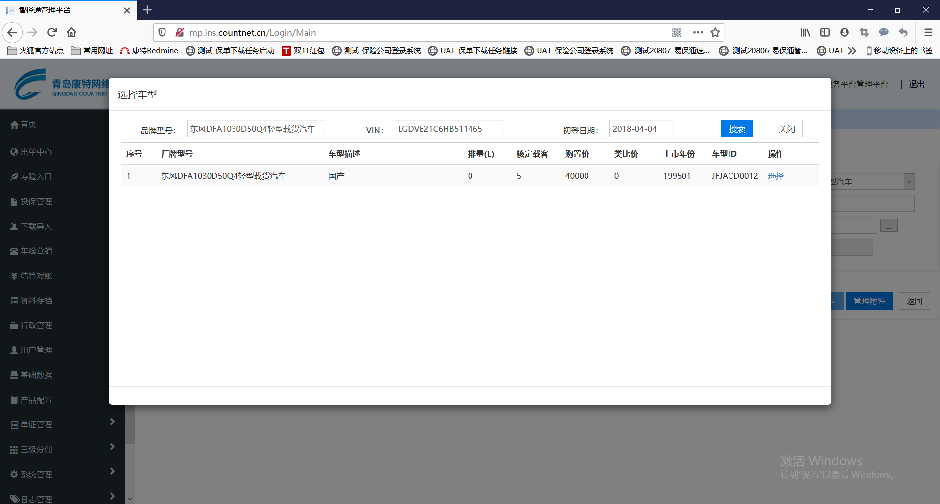 在正式上能查到车型,测试上查不到。测试品牌型号:东风DFA1030D50Q4轻型载货汽车